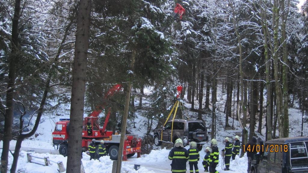 Profesionální hasiči z Dobrušky a Rychnova nad Kněžnou i dobrovolní hasiči z Deštného v Orlických horách pomáhali 14. ledna 2018 vytáhnout terénní vozidlo, které skončilo po nehodě mimo komunikaci v potoce.