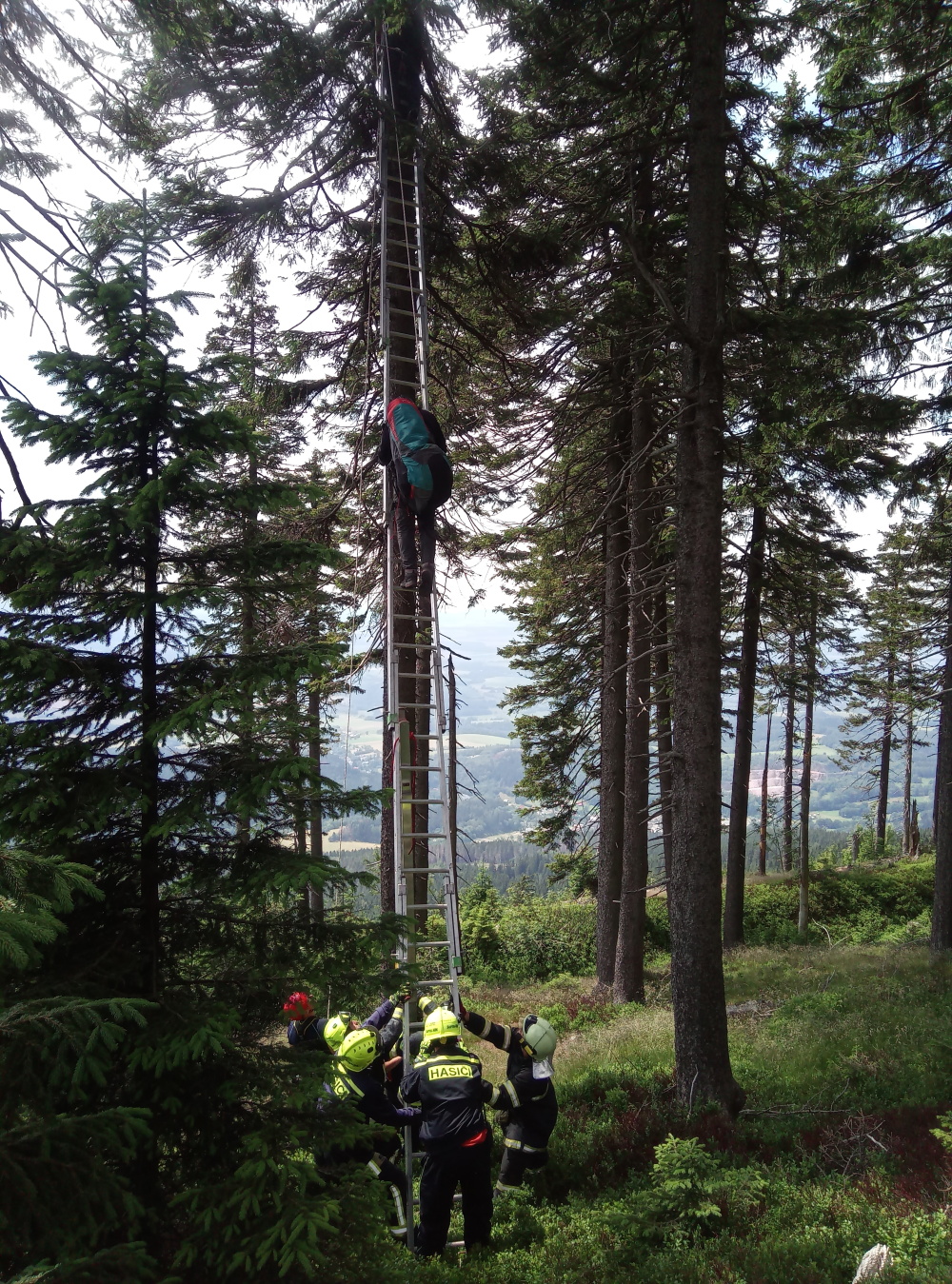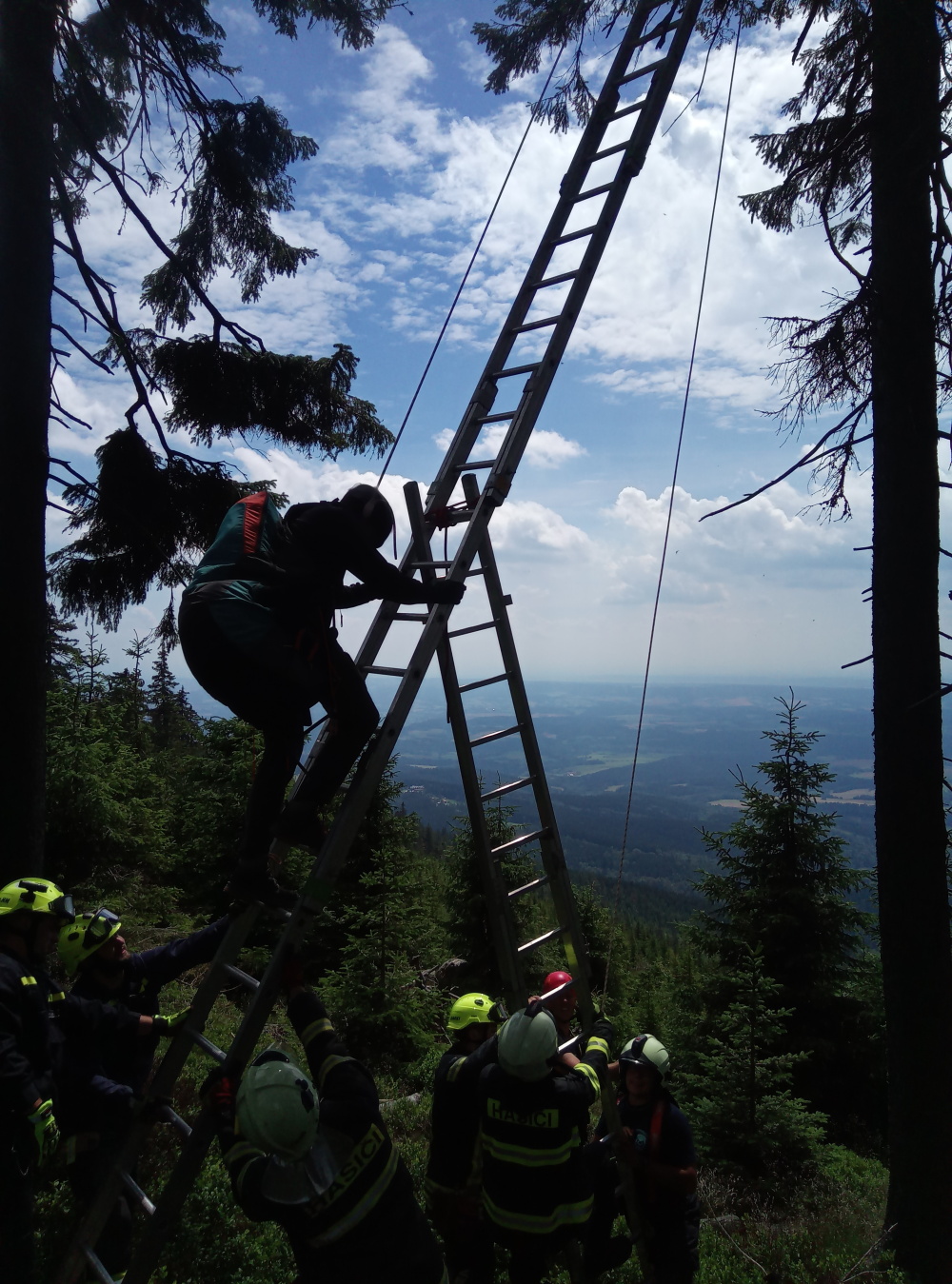 Dvě jednotky hasičů, profesionální ze stanice Trutnov a dobrovolná z Horního Maršova, vyjely na pomoc paraglidistovi, který skončil na Černé hoře v Krkonoších v korunách stromů.