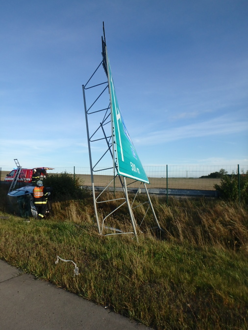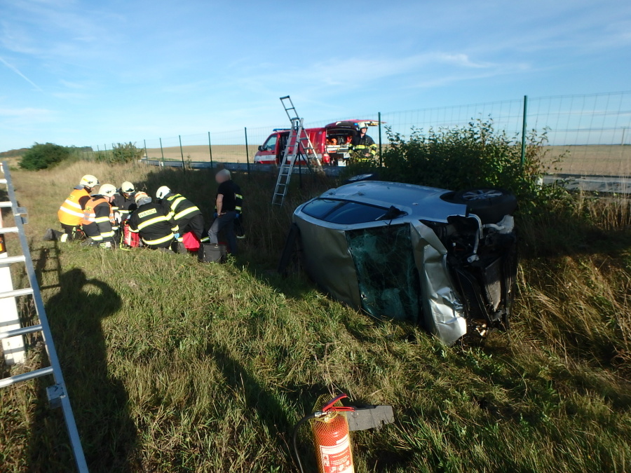 Po nehodě skončil osobní vůz mimo dálnici na boku
