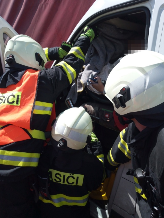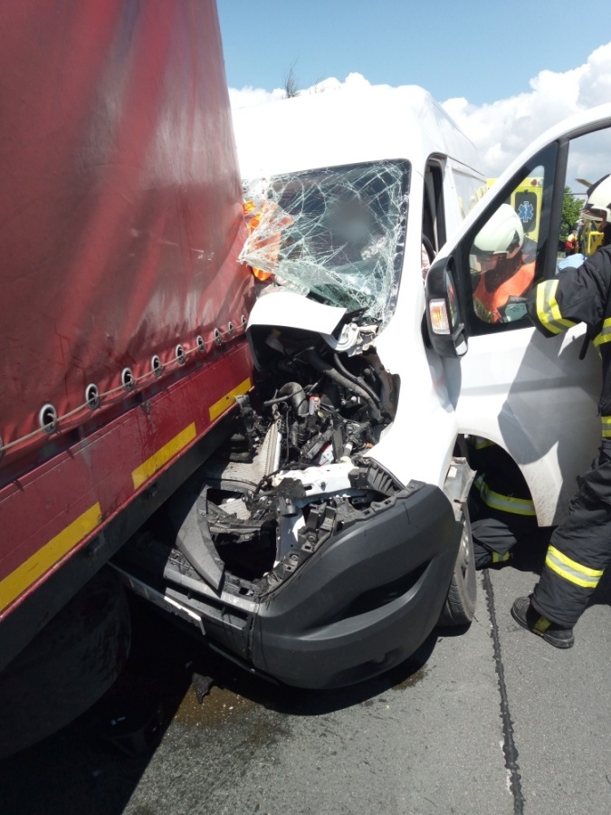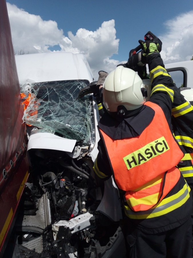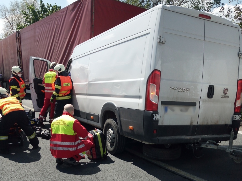 Po srážce dodávky a nákladního vozidla hasiči vyprošťovali