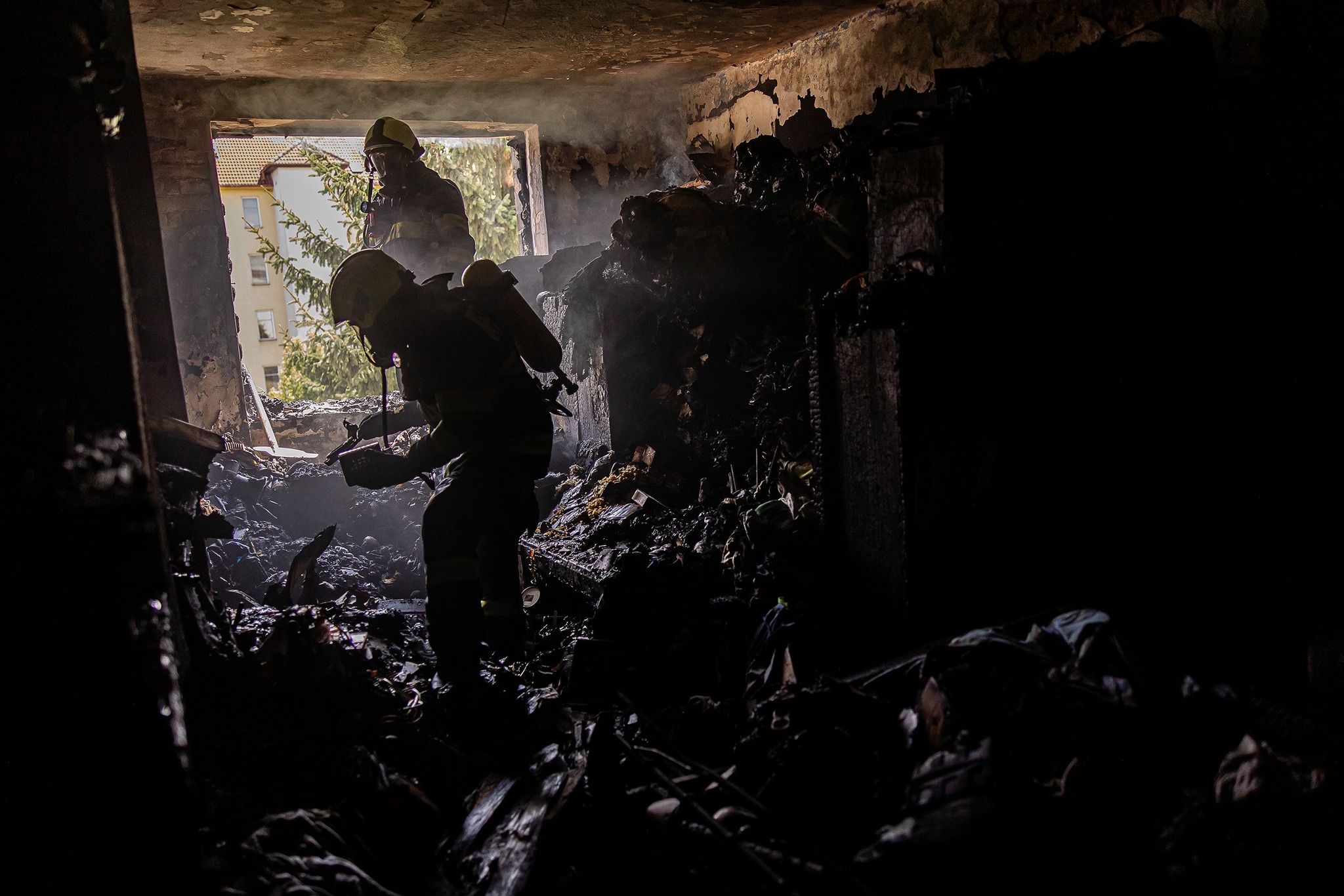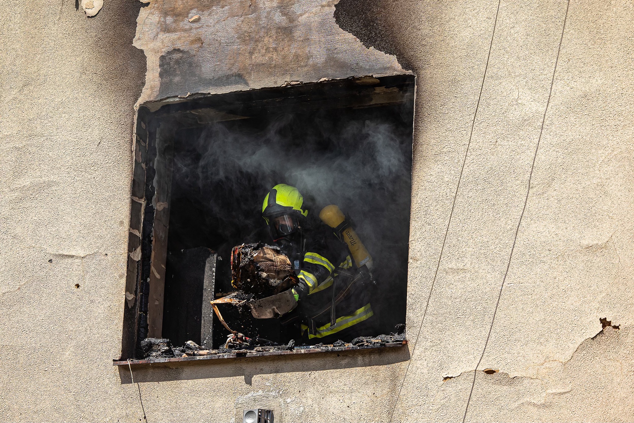 Mezitím se jednotky soustředily na hasební zásah uvnitř domu. Ze zasaženého bytu se požár rozšířil do půdních prostor, hasiči tak využili mimo jiné i vysokotlaké zařízení CCS Cobra, pomocí něhož vytvářeli otvory do stropu, kde ochlazovali zasažené konstrukce. Zároveň také kontrolovali ostatní byty v domě. Lokalizaci požáru ohlásil velitel zásahu kolem 16:30 hod. Dále mohly jednotky pokračovat v dohašování ohnisek a vyklízení nahromaděného materiálu z bytu do přistavěných kontejnerů. Za tímto účelem byly povolány ještě další síly a prostředky z řad dobrovolných hasičů. Odhaduje se, že práce budou pokračovat do večera, požářiště bude pak po celou noc pod dohledem místní dobrovolné jednotky.
