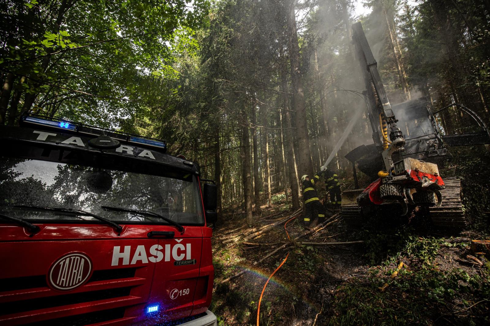 Požár harvestoru v lesním porostu