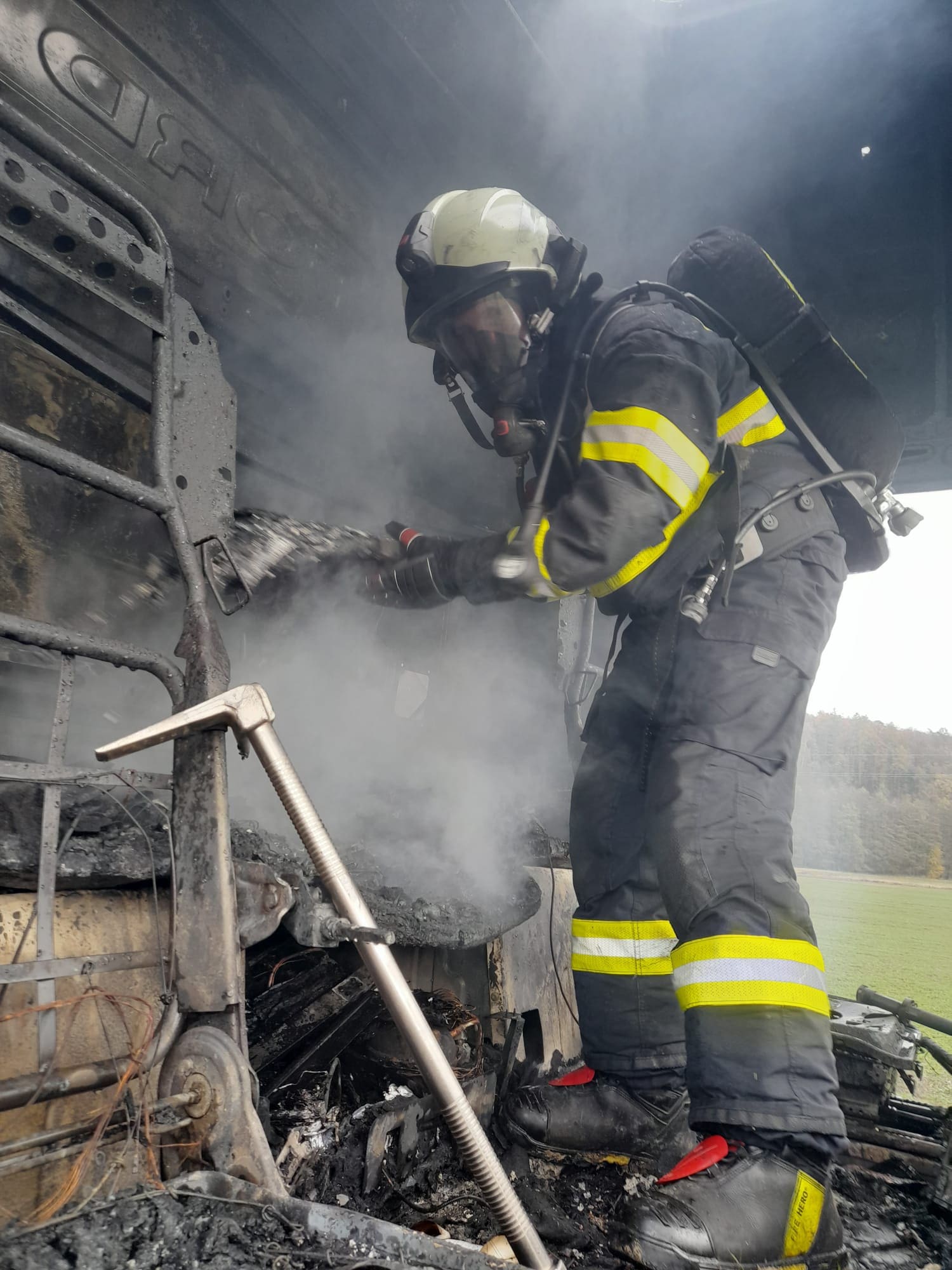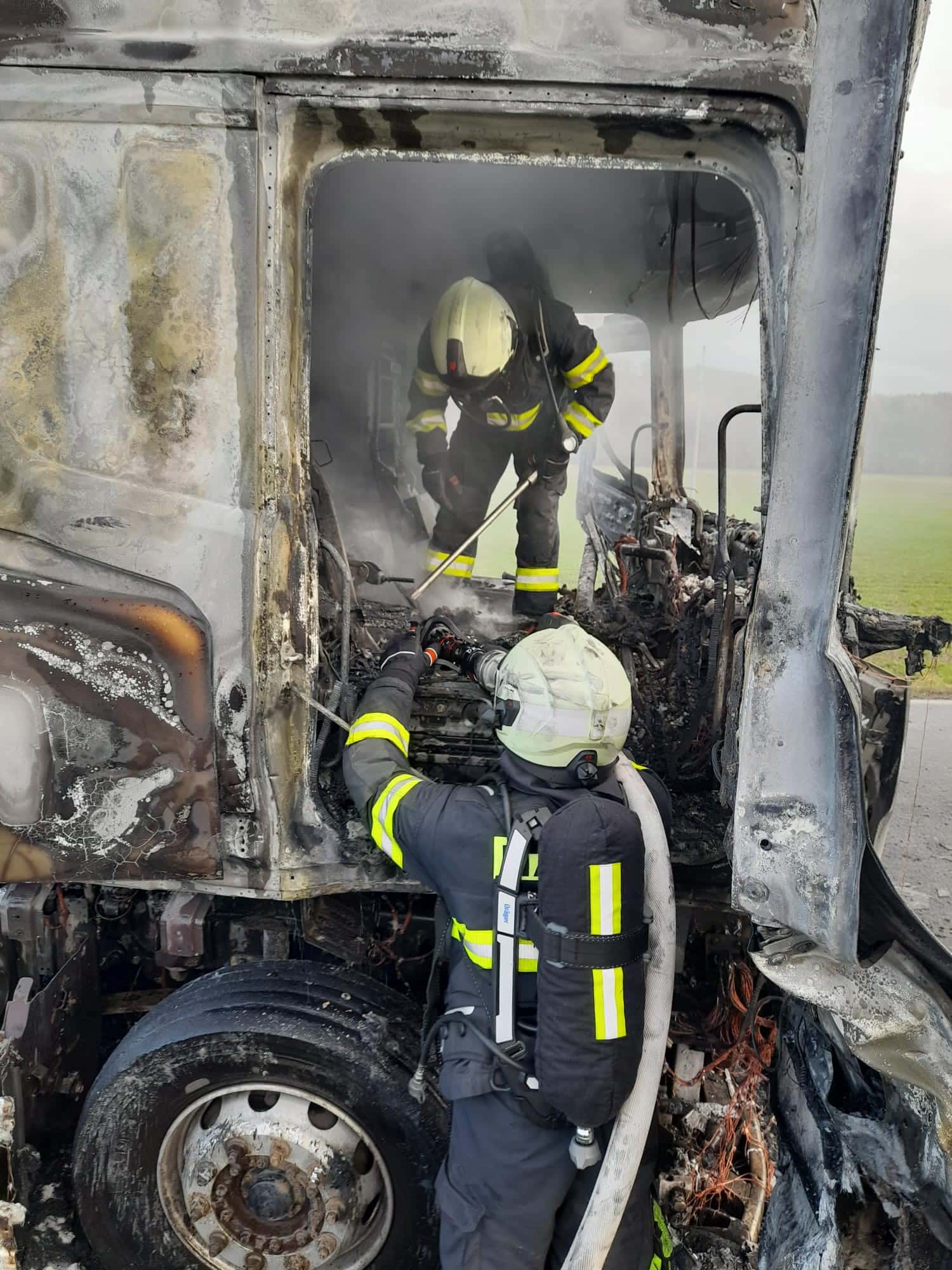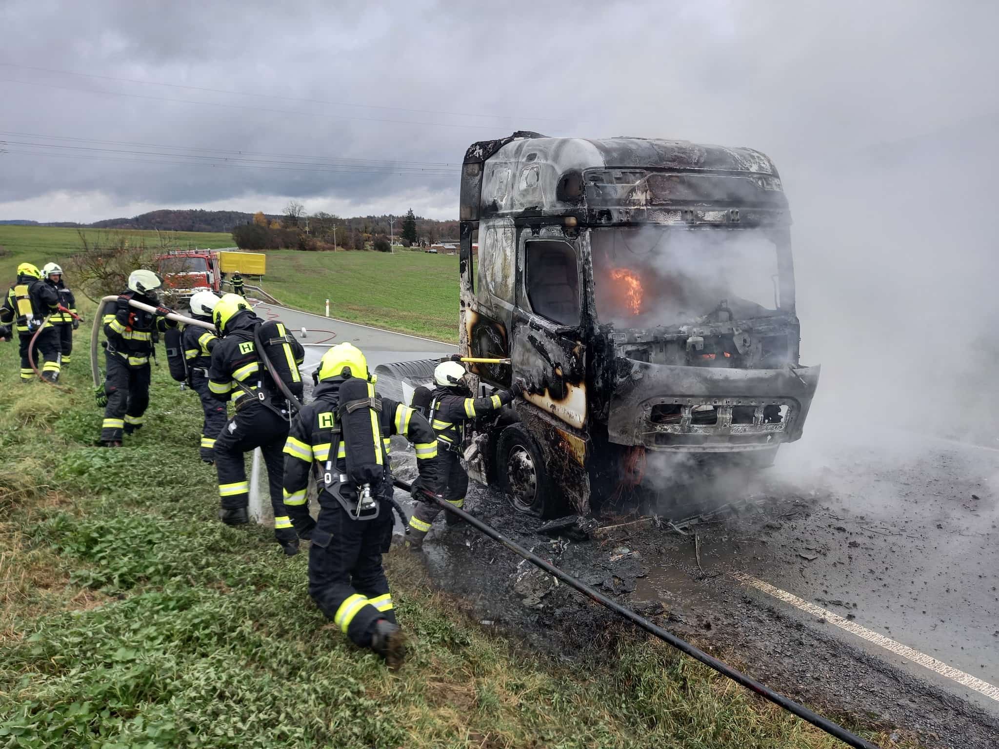 Ve 12:24 přišla na operační středisko informace o požáru tahače. Na místo vyjely jednotky profesionálních i dobrovolných hasičů. Po příjezdu byl vůz již zasažen plameny v motorové části. Hasiči nasadili tři vodní proudy a během krátké chvíle dostali oheň pod kontrolu. Lokalizace následovala rychle, bez nutnosti dalších speciálních technik. Následně proběhla úplná likvidace, aby se zabránilo opětovnému vznícení.