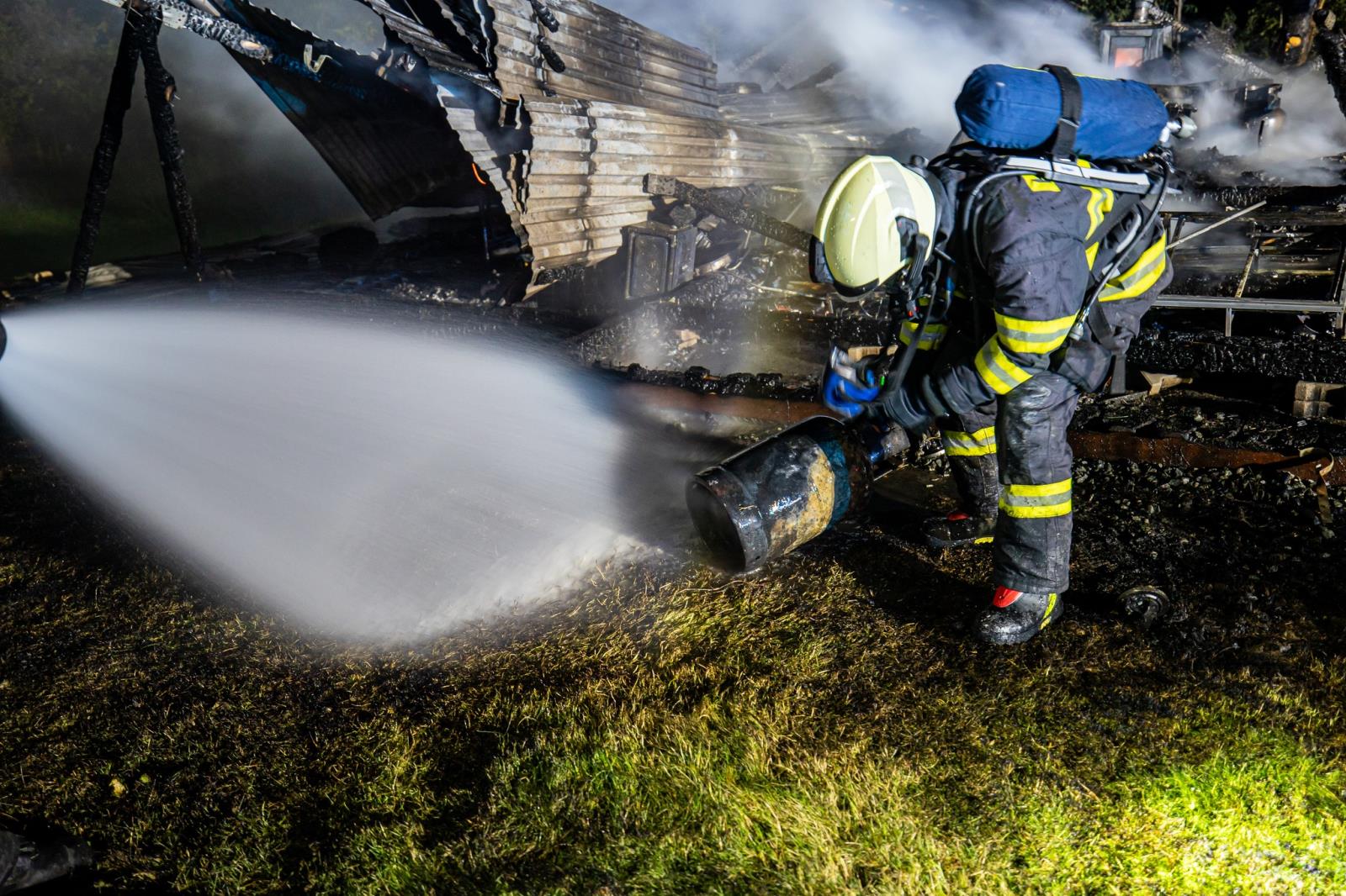 Krátce před 22. hodinou vyjely jednotky z 2. stupně požárního poplachu do obce Val u Dobrušky k požáru dřevěného stavení a několika vzrostlých stromů. V době příjezdu prvních hasičů na místo zásahu byla již chatka kompletně zasažena požárem. Hasiči hasili dvěma vodními proudy, soustředili se také na ochranu okolí. Pomocí termokamery bylo v požářišti postupně nalezeno pět talkových nádob. Jejich teplota byla vlivem požáru vysoká, proto bylo nutné provádět jejich ochlazování vodním proudem. Na místě zasahovali profesionální hasiči z Dobrušky a Rychnova nad Kněžnou, dobrovolní hasiči JSDH Opočno, Nové Město nad Metují, Dobruška a Domašín.