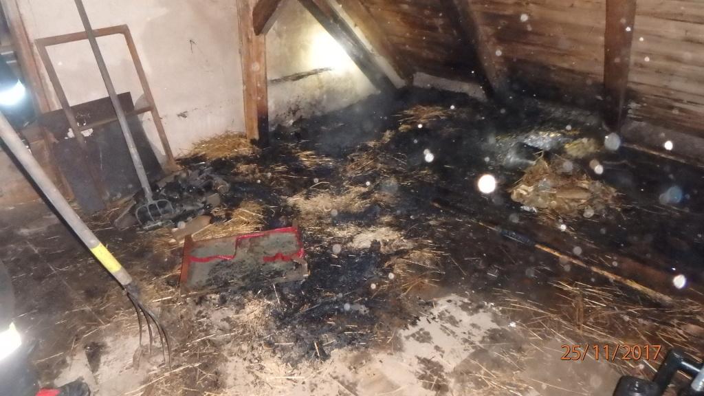 Hasiči prozkoumali místo události a objevili menší ohniska požáru, která uhasili vysokotlakem. Na místě hořela sláma na prostoru asi 5 x 2 metry na půdě nízkopodlažního domku. Slámu museli hasiči vyházet ven z půdy a předali objekt majiteli.