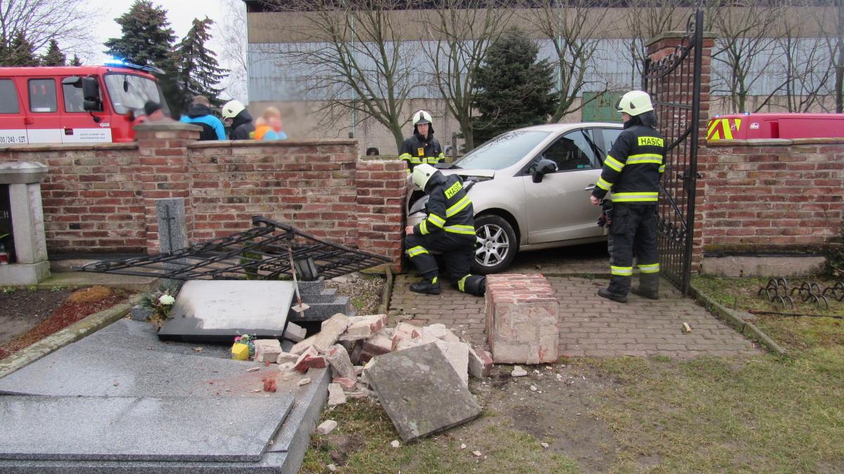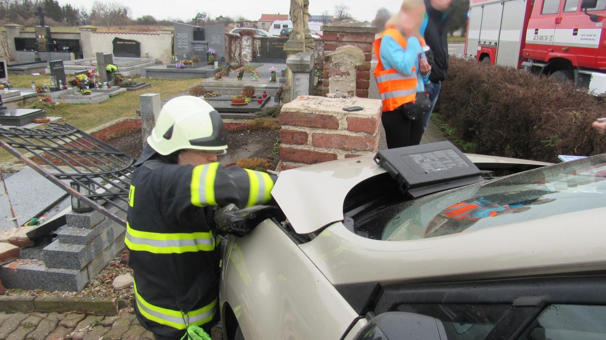 Profesionální jednotka z centrální stanice zasahovala u dopravní nehody osobního automobilu, který narazil do cihlové zdi místního hřbitova. Událost se obešla bez zranění. Hasiči místo události zajistili a vozidlo zajistili proti vzniku požáru. Zeď byla nárazem poškozena a jejím pádem došlo také k poničení náhrobku.