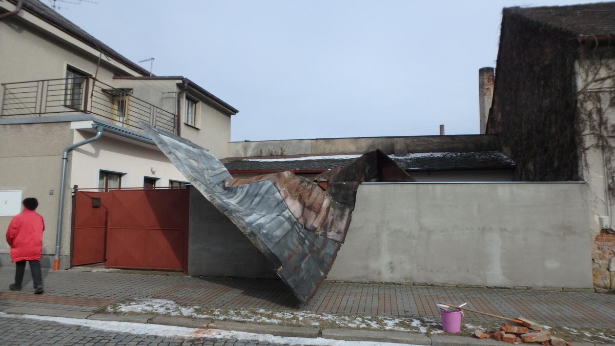V Denisově ulici pomáhali jičínští hasiči se zabezpečením uvolněné střechy. Střechu provizorně ukotvili.