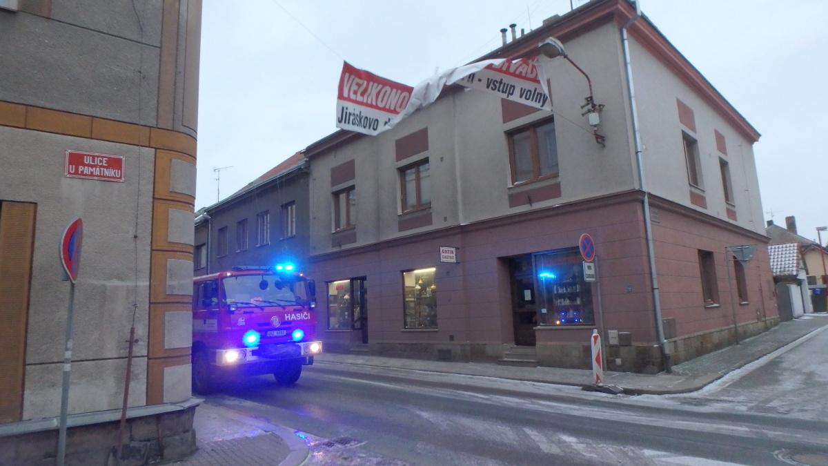Profesionální hasiči z Nového Bydžova pomáhali s odstraněním uvolněného reklamního poutače v Hradební ulici.