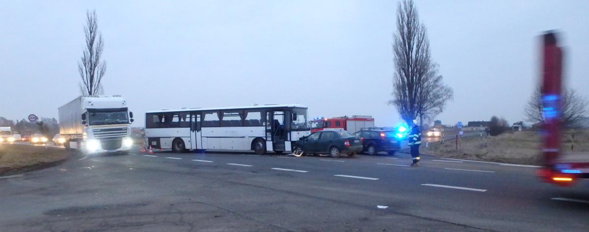 Dopravu mezi Hradcem Králové a Jaroměří na silnici I/33 blokovala v ranních hodinách dopravní nehoda osobního automobilu a autobusu. Při nehodě byla zraněna osoba v osobním voze. Cestující z autobusu vystoupili a bez zranění místo nehody opustili. Po došetření nehody policií zajistili hasiči úklid vozovky a odstranění havarovaných vozidel. Na místě zasahovali hasiči ze stanic Hradec Králové – Pražská, Jaroměř a Náchod.