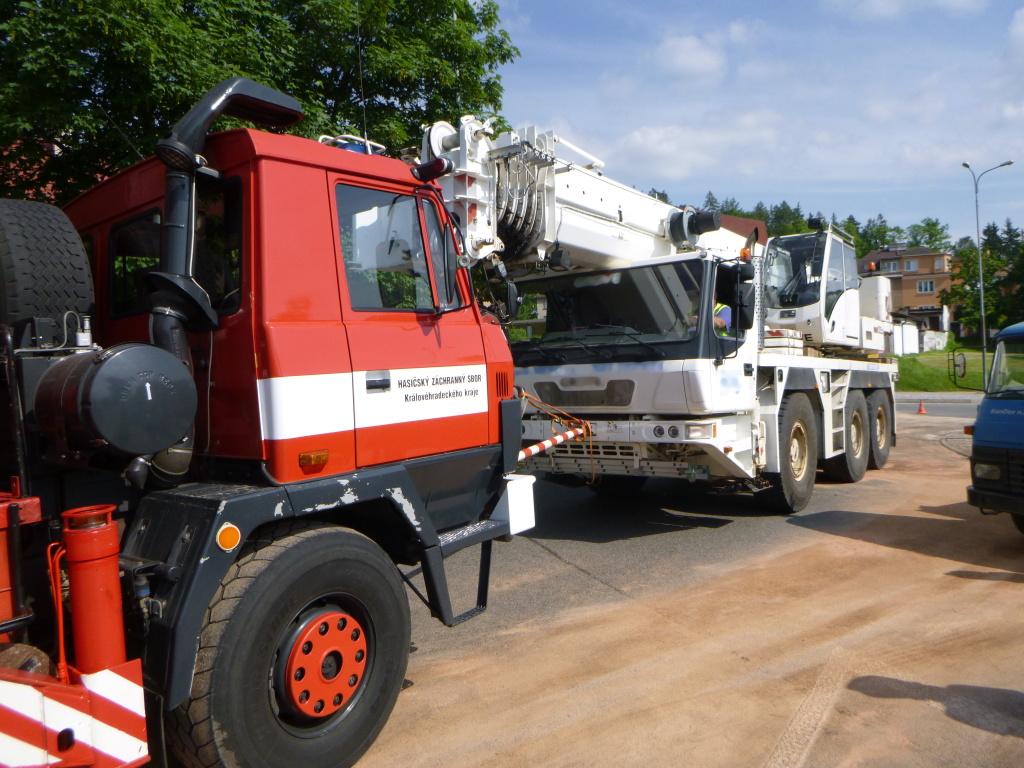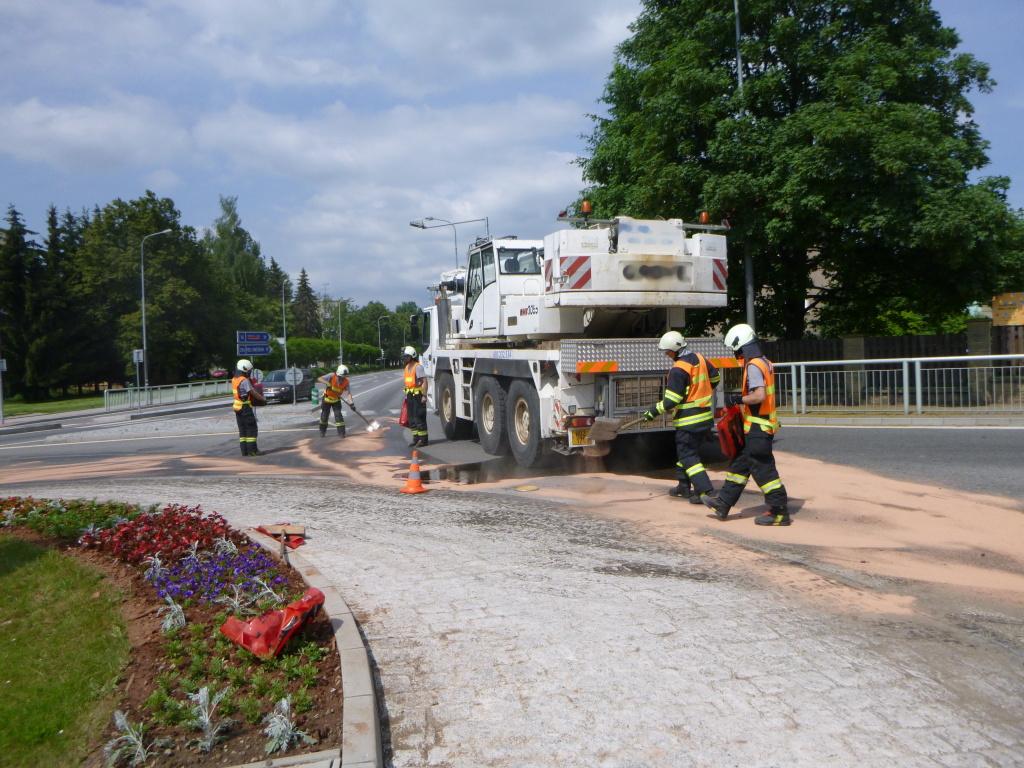 V části Horní Předměstí, Šibeník zasahovali na kruhovém objezdu profesionální hasiči z Trutnova, kde došlo k technické závadě autojeřábu. U vozidla praskla pneumatika, poškodila hadice s hydraulickým olejem a na vozovku tak uniklo větší množství této kluzké kapaliny. Hasiči začali po svém příjezdu ihned olej zachytávat pomocí vany a sorbentu. Po asi půl hodině už olej přestal unikat, ale jeřáb se nemohl z místa dostat sám. Na pomoc byl povolán vyprošťovací automobil, pomocí kterého hasiči poškozený jeřáb odtáhli mimo frekventovanou komunikaci. Po dobu zásahu byla vozovka průjezdná kyvadlově.