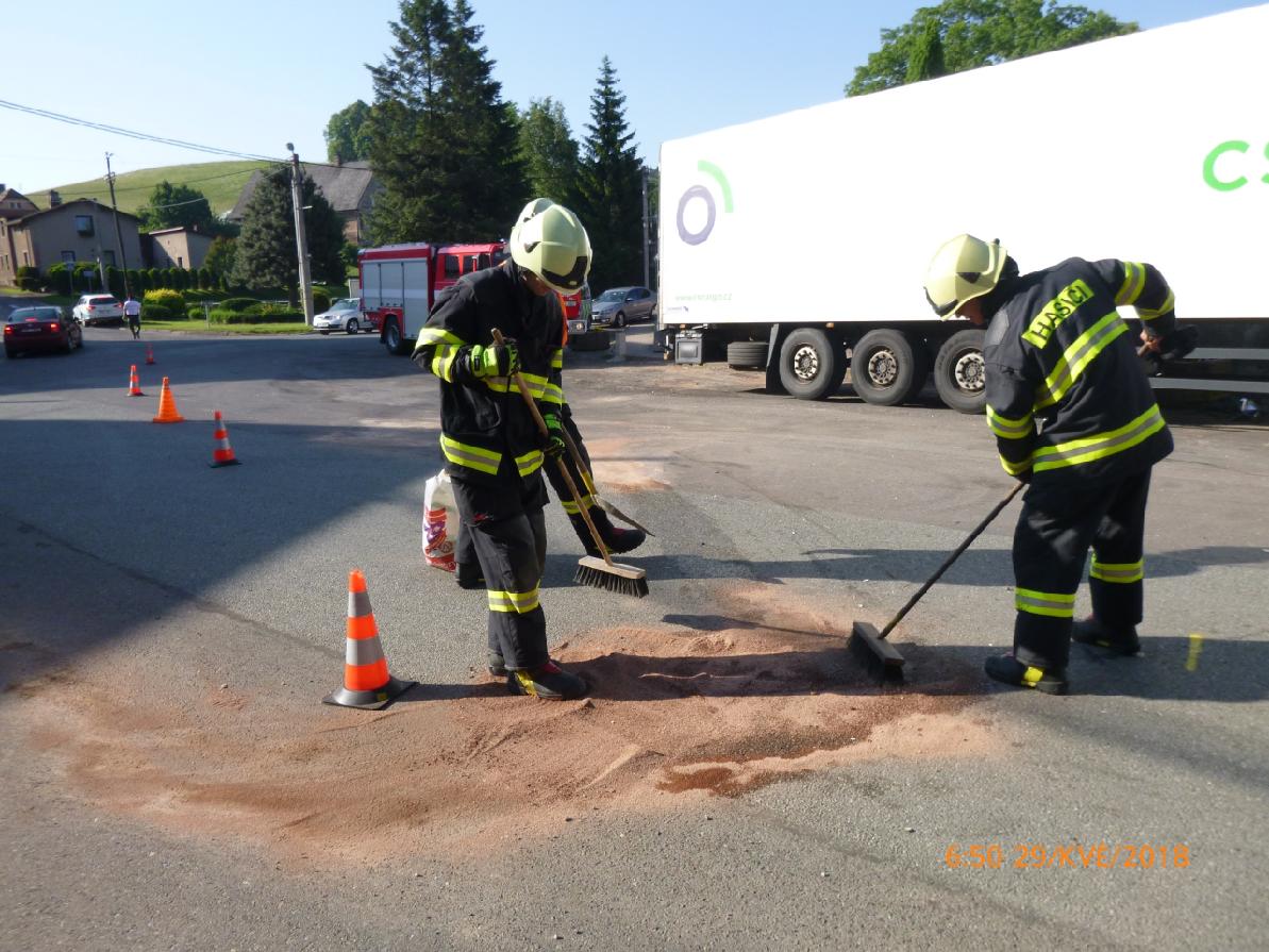 Broumovští profesionální hasiči byli ráno přivoláni k nehodě osobního a nákladního vozidla, ke které došlo v Jetřichově. Hasiči provedli na vozech protipožární opatření. V místě řídila jednotka až do příjezdu Policie ČR dopravu. Poté hasiči vozidla odstranili z komunikace a vozovku pomocí sorbentu uklidili.