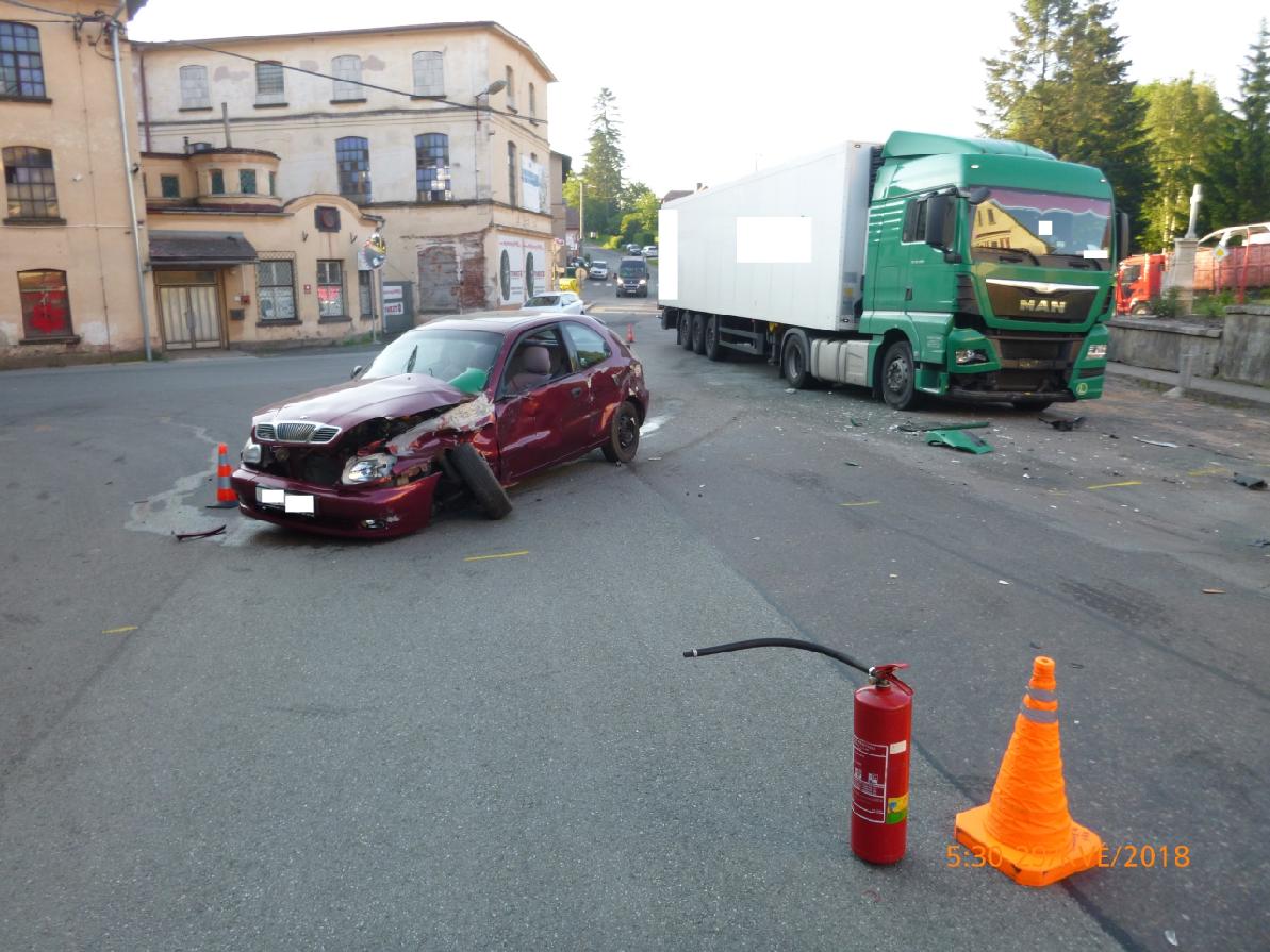 Profesionální hasiči z Jilemnice a Vrchlabí zasahovali odpoledne u dopravní nehody nákladního a dvou osobních vozidel. Ke střetu došlo na silnici I/14 ve Vrchlabí. Komunikace byla zcela uzavřena. Hasiči museli jednu zaklíněnou osobu z automobilu vyprostit. Muž byl poté naložen do vrtulníku a letecky transportován do fakultní nemocnice. Další čtyři zraněné osoby byly odvezeny do nemocnice sanitními vozy. Hasiči provedli na vozidlech protipožární opatření. Uniklé provozní kapaliny zasypala jednotka