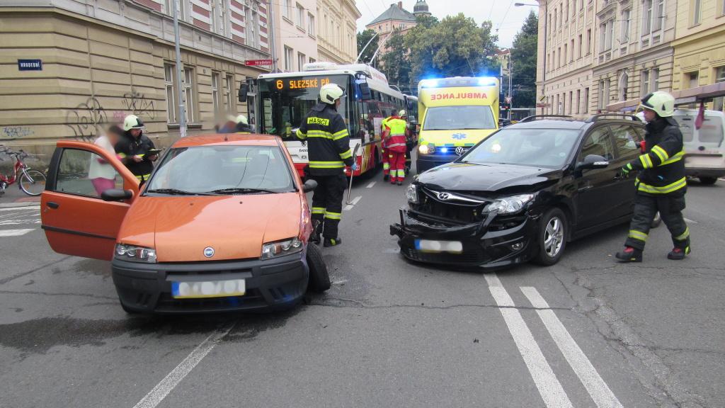 Na křižovatce Šimkovy a Pospíšilovy ulice zasahovali profesionální hasiči z centrální stanice u dopravní nehody dvou osobních vozidel. Při nehodě došlo ke zranění jedné osoby. Hasiči místo nehody zajistili a provedli protipožární opatření. Po zadokumentování policií zajistila jednotka odstranění následků nehody a úklid komunikace.