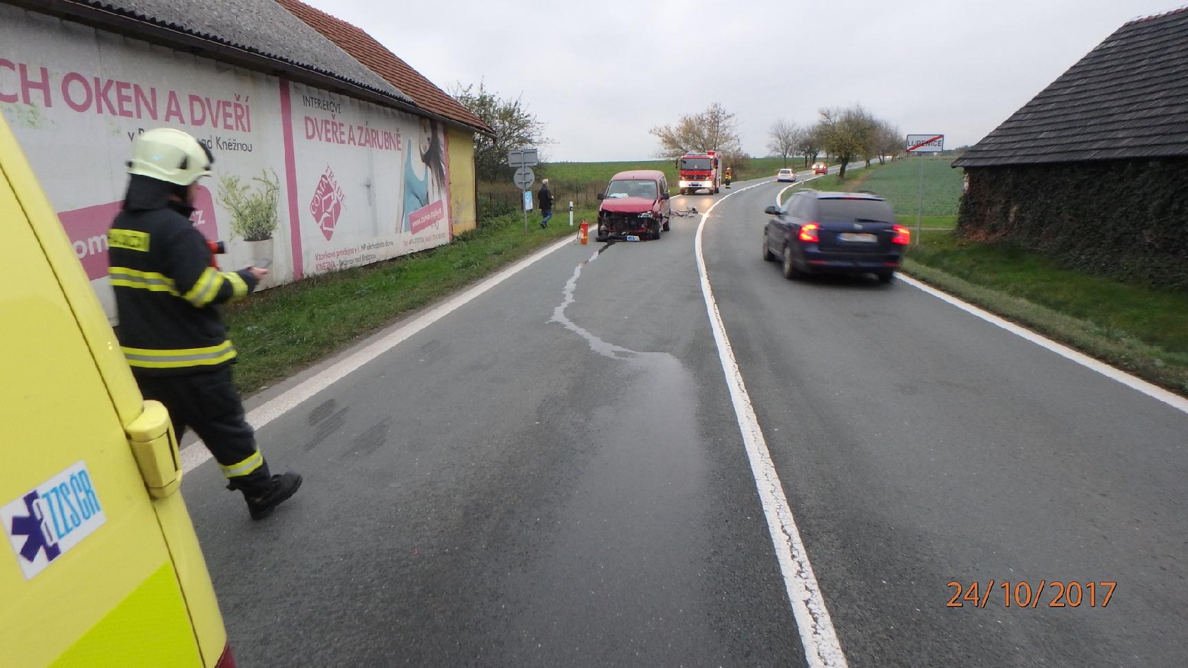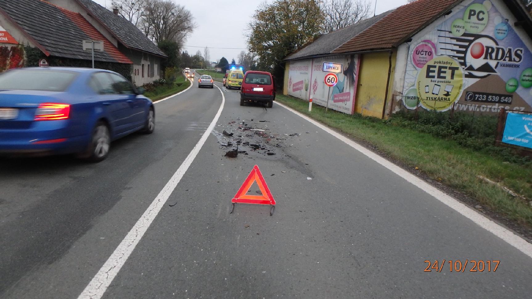 Ke střetu dvou osobních vozidel, který se stal v Lupenici, byli v 17:09 přivoláni profesionální hasiči z Rychnova nad Kněžnou. Dvě osoby utrpěly zranění. Byly ošetřeny zdravotnickou záchrannou službou a odvezeny do nemocnice. Hasiči provedli na autech protipožární opatření. V místě nehody řídili dopravu. Jednotka pomohla s naložením vozu na odtah, druhé bylo odstaveno mimo komunikaci. Hasiči provedli úklid vozovky od střepů a plastových částí.