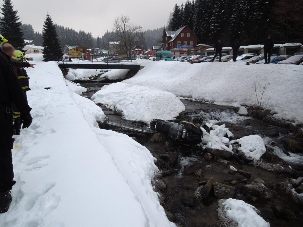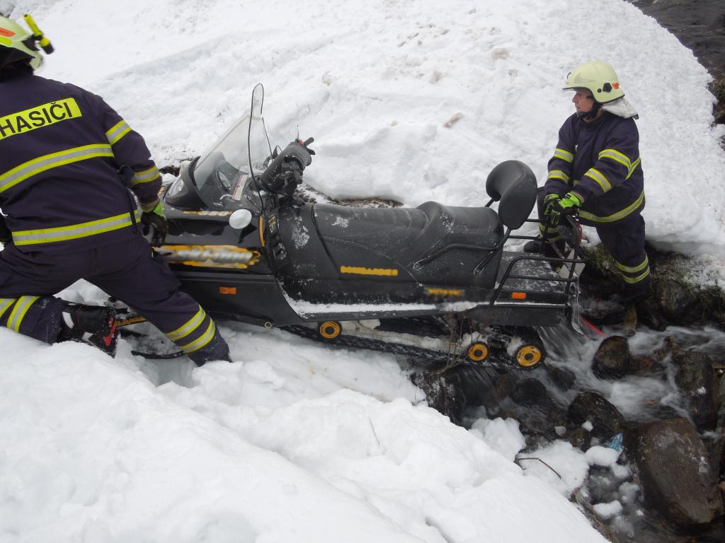 Profesionální hasiči z Trutnova a dobrovolní hasiči z Pece pod Sněžkou zasahovali u dopravní nehody sněžného skútru. Ten sjel mimo cestu do potoka. Jedna osoba skončila v péči členů horské služby a záchranářů. Hasiči vyprostili skútr z vody pomocí navijáku. K úniku provozních kapalin nedošlo.
