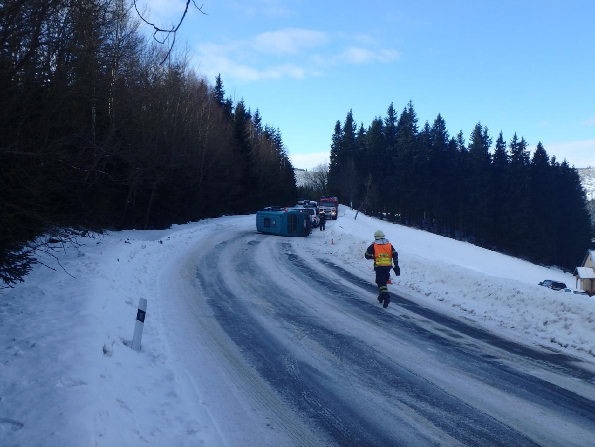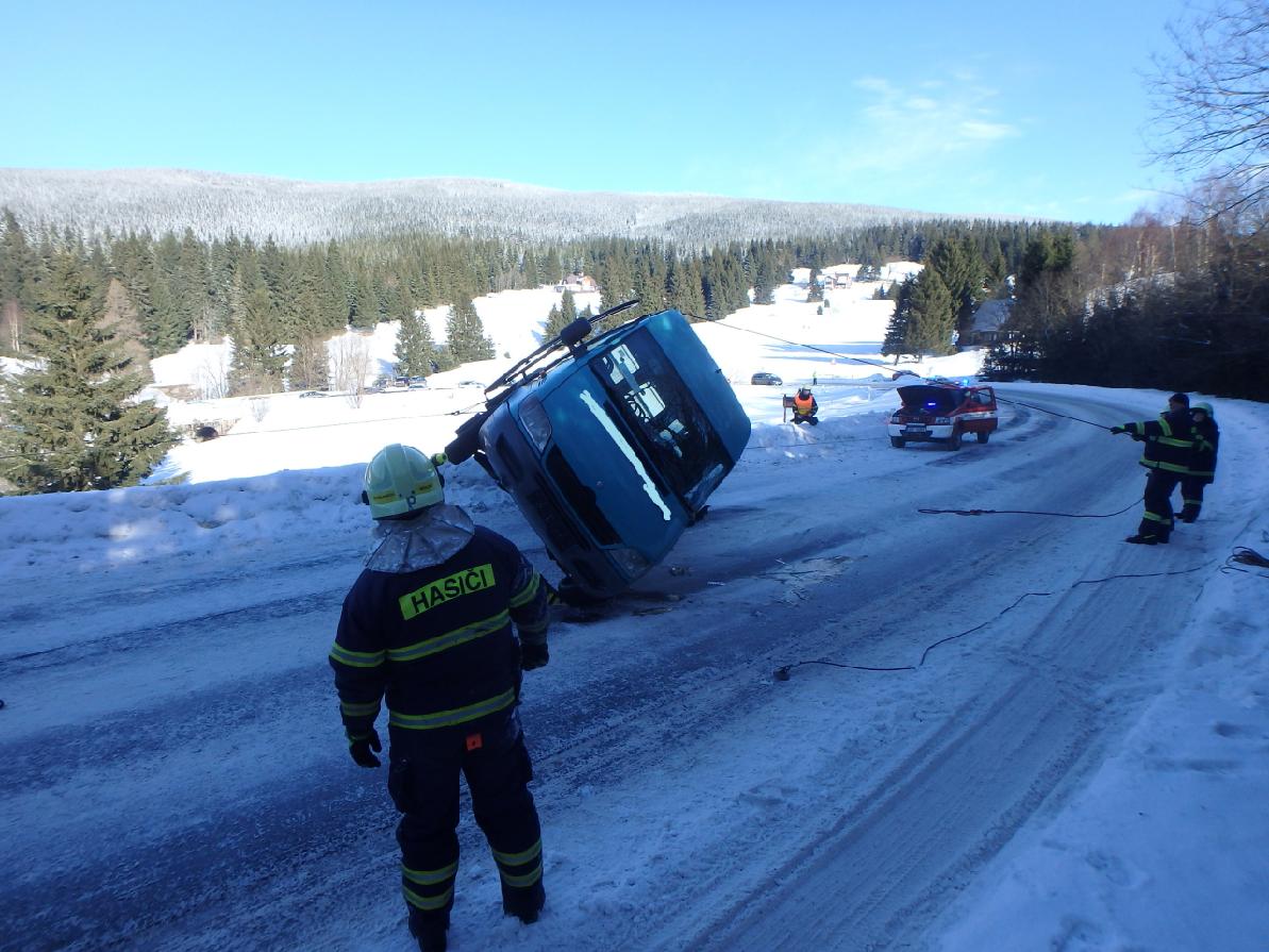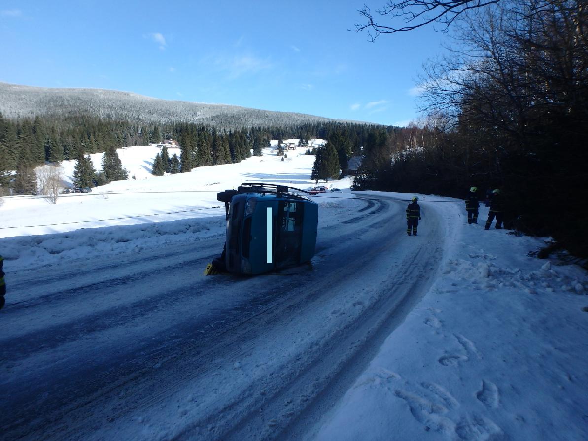 Profesionální hasiči z Trutnova a dobrovolní hasiči z Pece pod Sněžkou zasahovali dopoledne při dopravní nehodě skibusu, ke kterému došlo na silnici před Pomezními boudami. Vozidlo se převrátilo na bok a zablokovalo komunikaci. Ke zranění osob nedošlo. Jednotky skibus pomocí navijáku postavily zpět na kola a provedly úklid vozovky.
