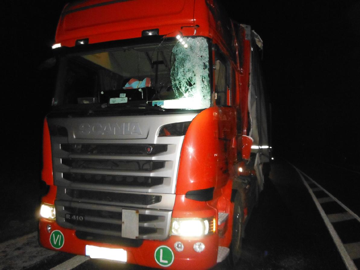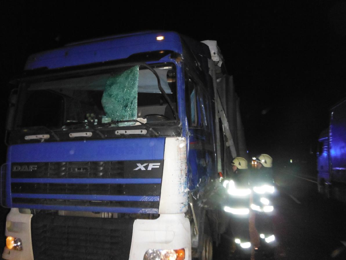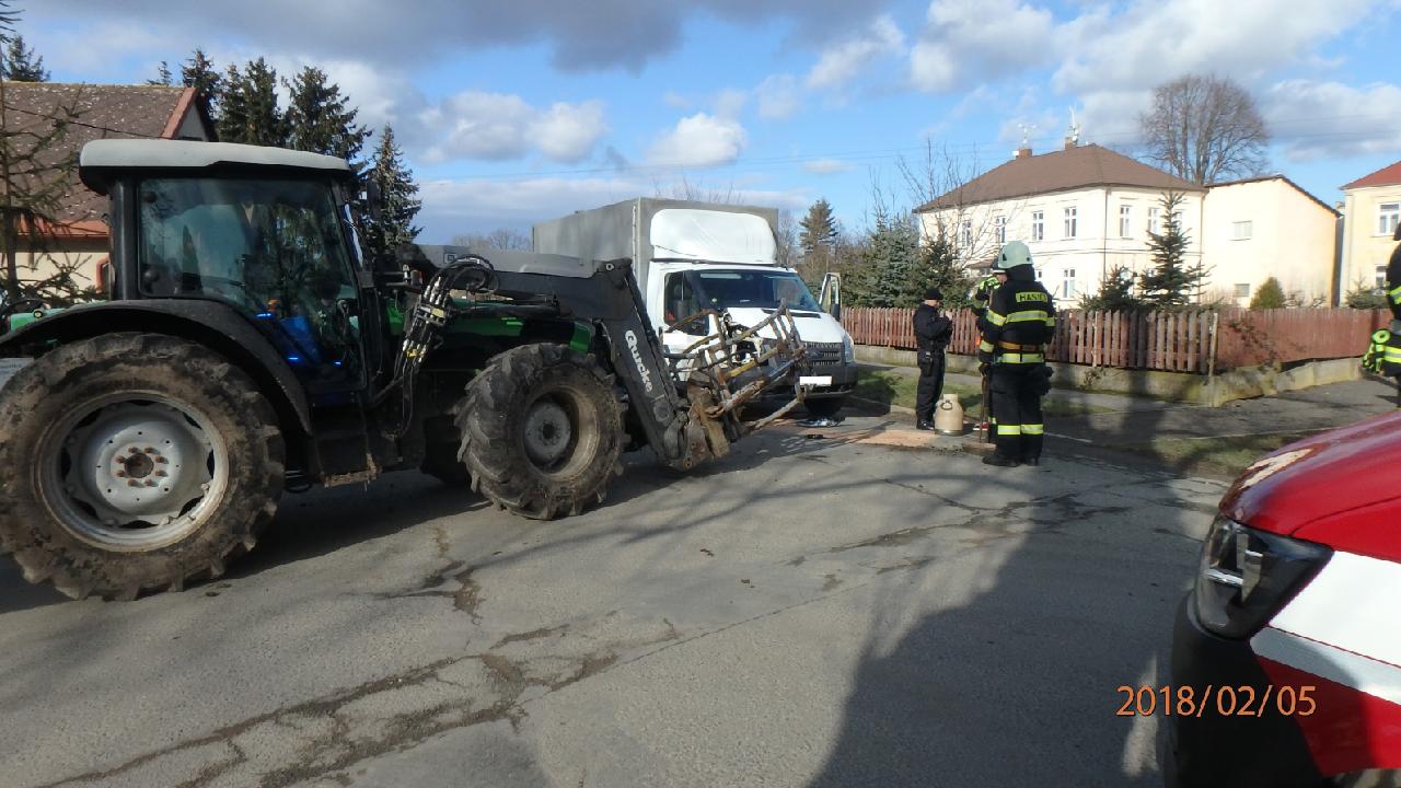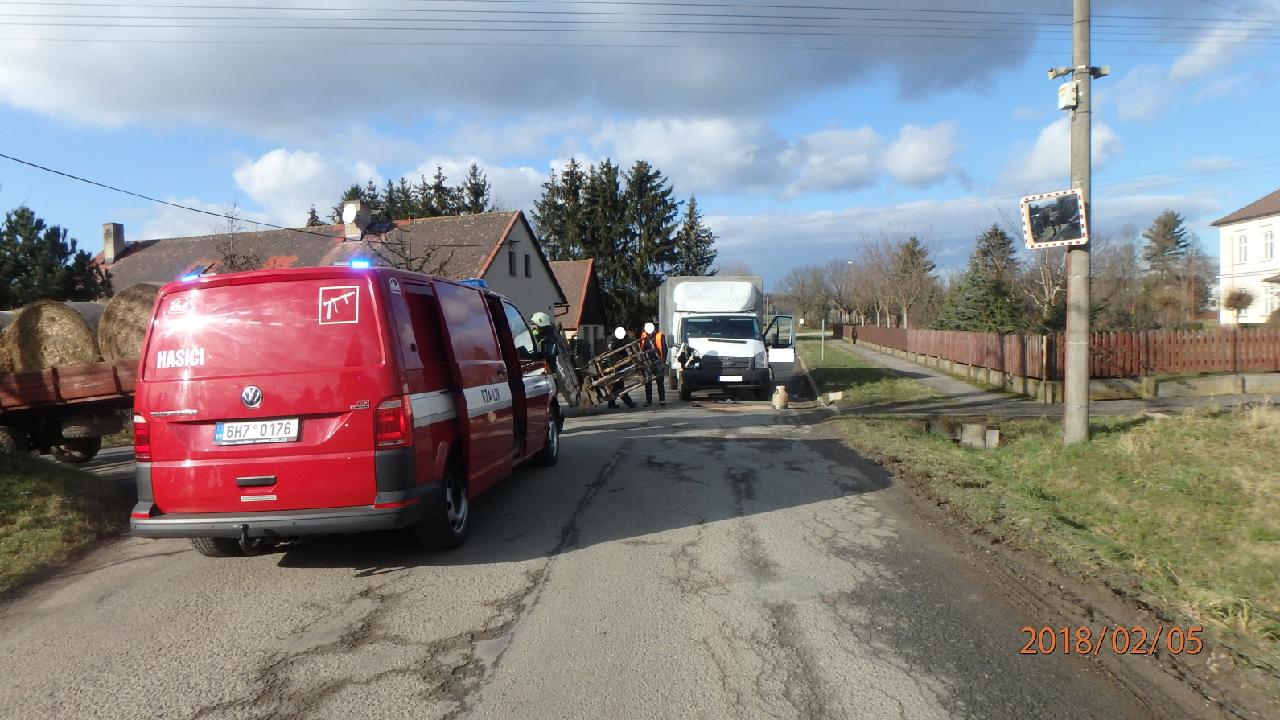 Ke střetu dvou nákladních vozidel byli večer přivoláni hořičtí profesionální hasiči. Nehoda se stal na silnici I/35 mezi obcemi Milovice a Klenice. Dvě zranění osoby byly odvezeny zdravotnickou záchrannou službou na ošetření do nemocnice. Hasiči uklidili vozovku od střepů a plastových úlomků.