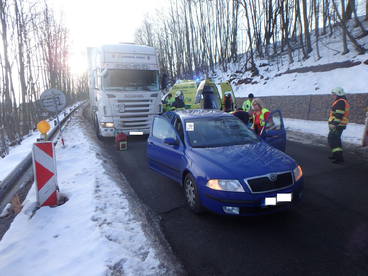 Profesionální hasiči z Trutnova vyjeli ráno ke střetu osobního a nákladního automobilu do obce Mladé Buky.