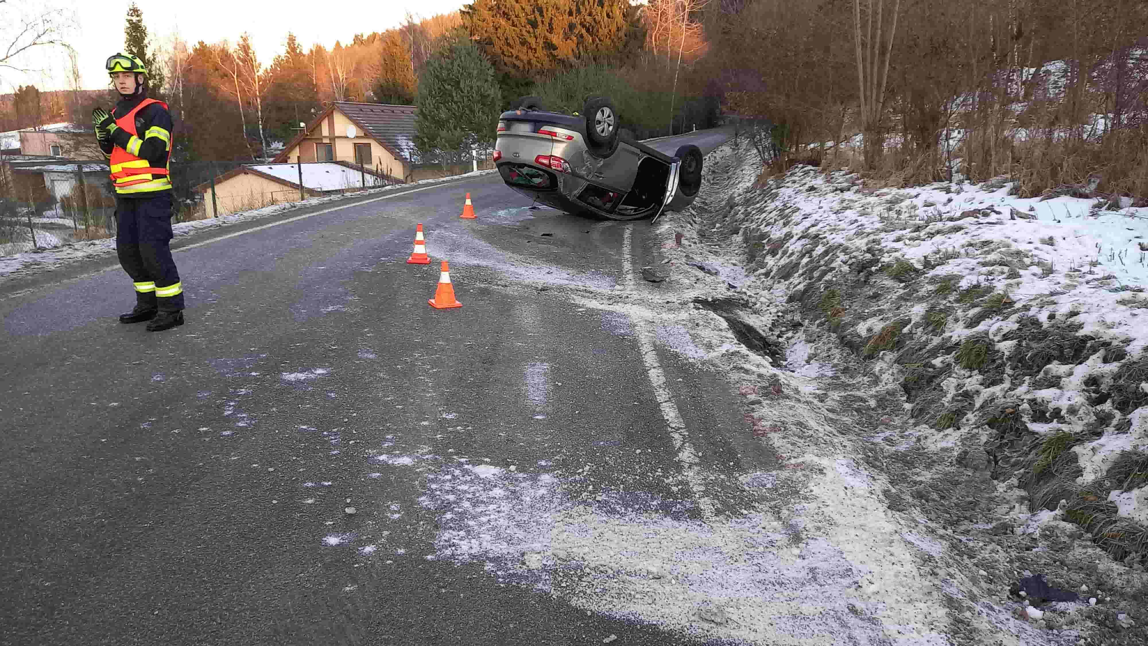Nedělní ráno přineslo v Královéhradeckém kraji zvýšený počet výjezdů hasičů k dopravním nehodám. Dvě osobní vozidla skončila na střeše. Osoby vyvázly bez zranění, situace však znovu upozornila na nutnost opatrnosti.