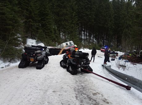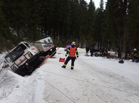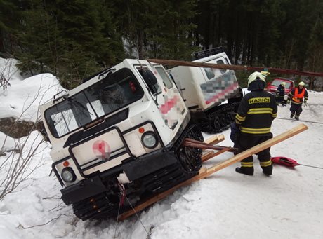 Převrácenou rolbu vyprošťovali hasiči v Peci pod Sněžkou