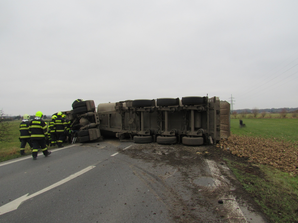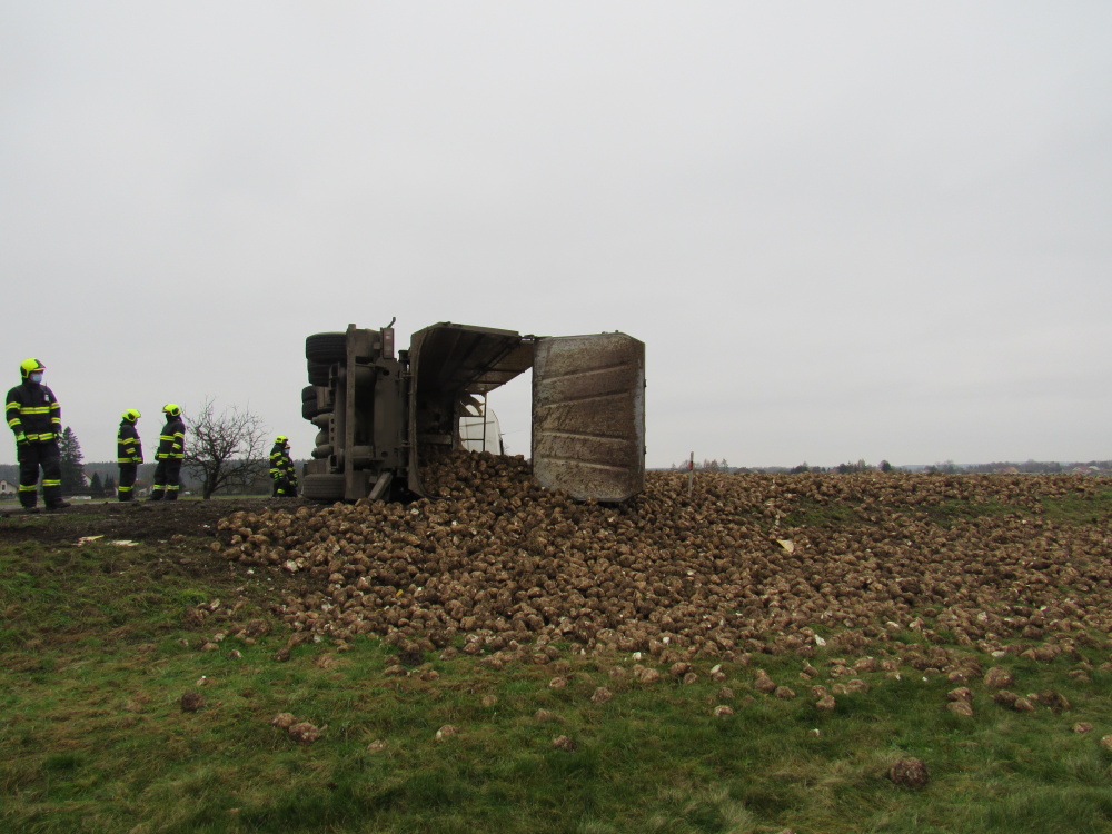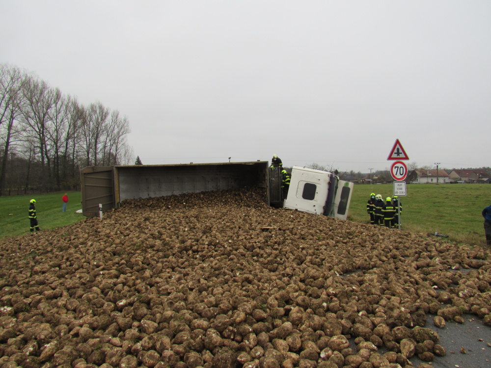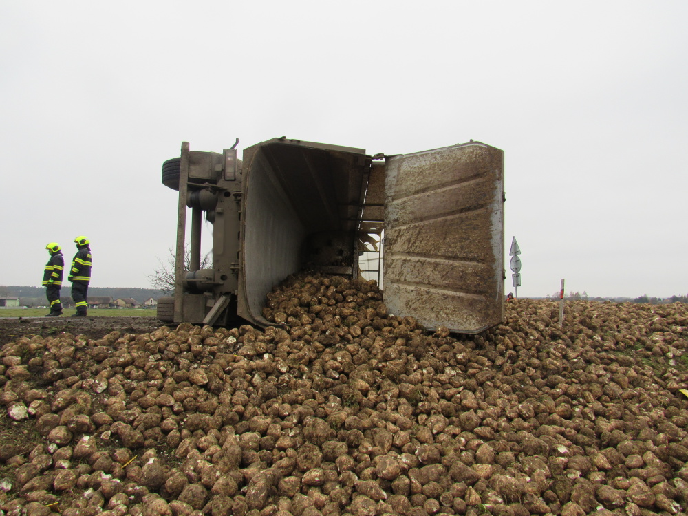 K dopravní nehodě kamionu, který převážel řepu, byli vysláni profesionální hasiči z centrální stanice Hradec Králové a dobrovolné jednotky z Týniště nad Orlicí a Kostelce nad Orlicí. Nehoda se stala na silnici č. 11 mezi Lípou nad Orlicí a Česticemi, komunikace byla kvůli převrácenému autu  a vysypanému nákladu neprůjezdná. Na místě spolupracovali hasiči s Policií ČR a zástupci Správy a údržby silnic, při nehodě nebyl nikdo zraněn. Překládku vysypané řepy zajišťoval řidič havarovaného automobilu. Jednotky zajistily místo události a zabezpečily vozidlo proti vzniku požáru. Z auta unikly provozní kapaliny. Na místo události byl vyslán technický kontejner z královéhradecké centrály, který je mimo jiné vybaven technickými prostředky na přečerpání pohonných hmot. Z převráceného nákladního auta odčerpali hasiči asi 300 litrů nafty, dále odčerpali asi 100 litrů hydraulického oleje. Následně provedla specializovaná firma za asistence jednotek vrácení vozidla zpět na kola. Menší množství nafty uniklo mimo komunikaci do příkopu, o této skutečnosti byli vyrozuměni zástupci orgánů ochrany životního prostředí. Jednotky se na závěr postaraly o úklid vozovky i její oplach a po 15. hodině se vracely zpět na základny.