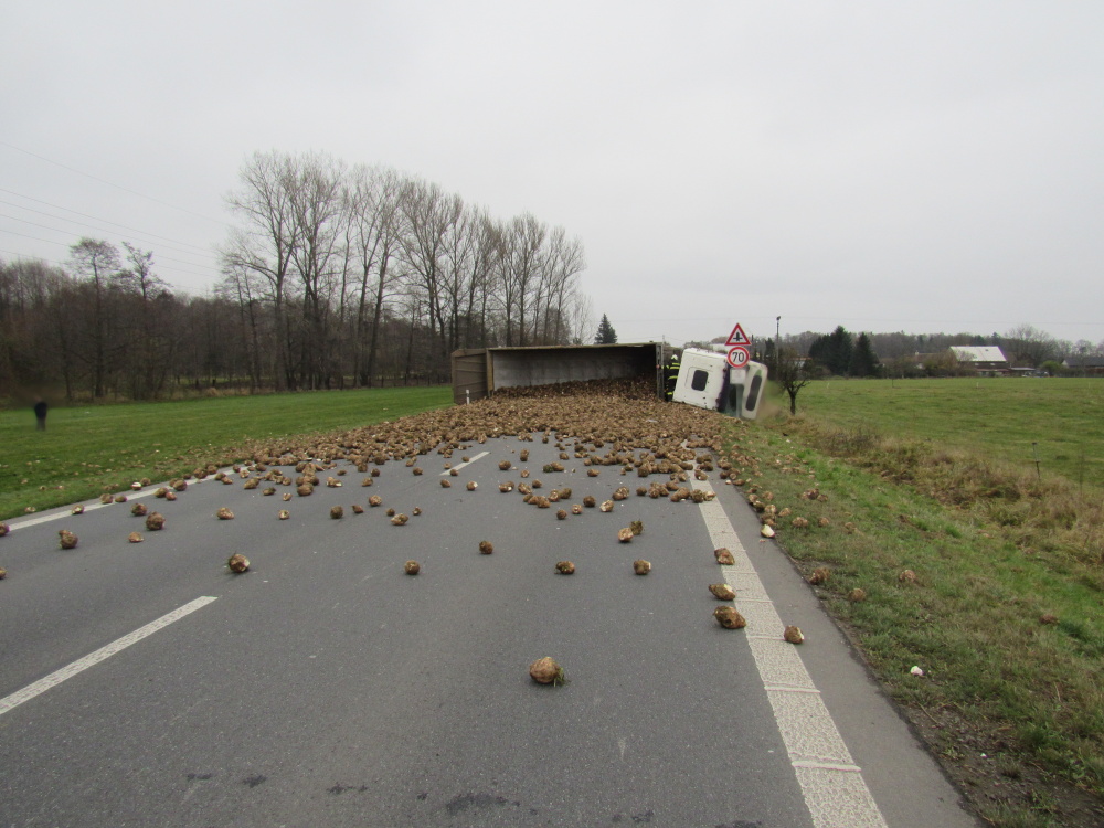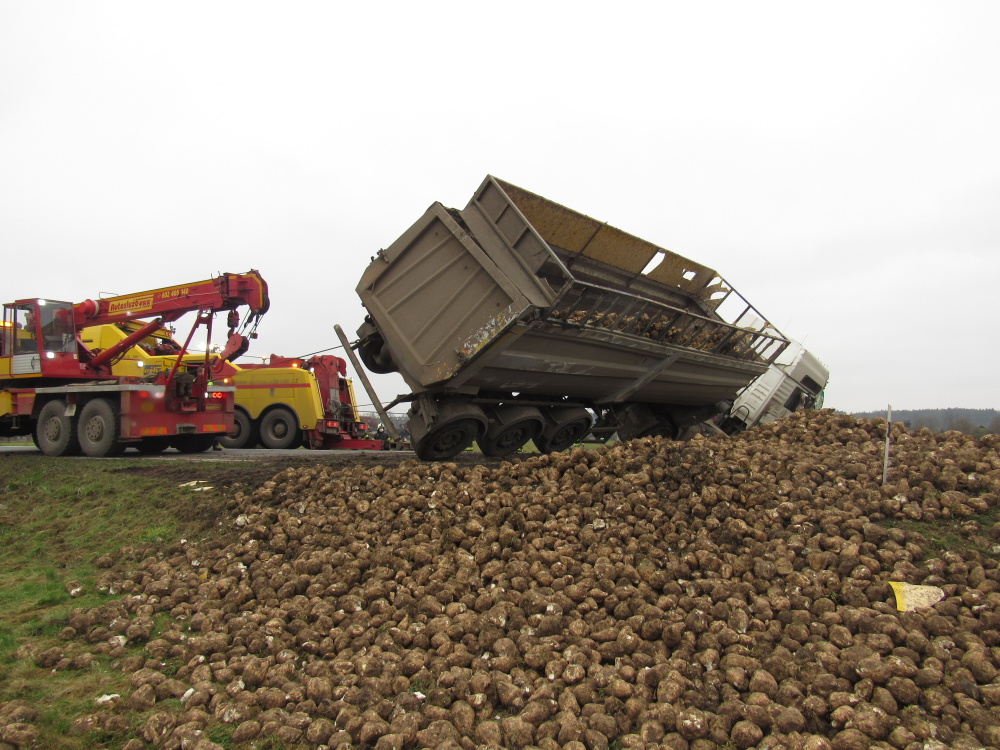 Převrácený kamion s řepou blokoval silnici č. 11