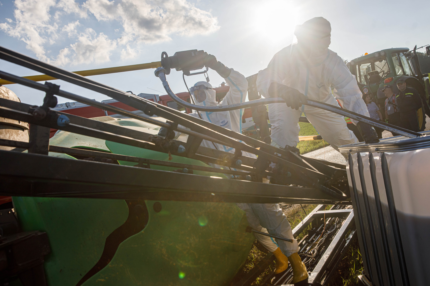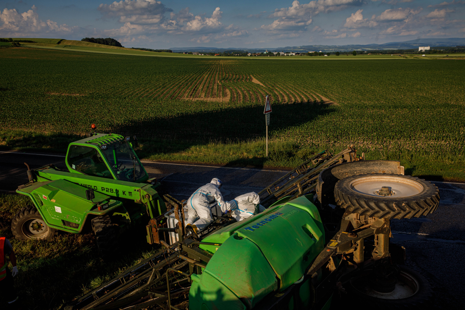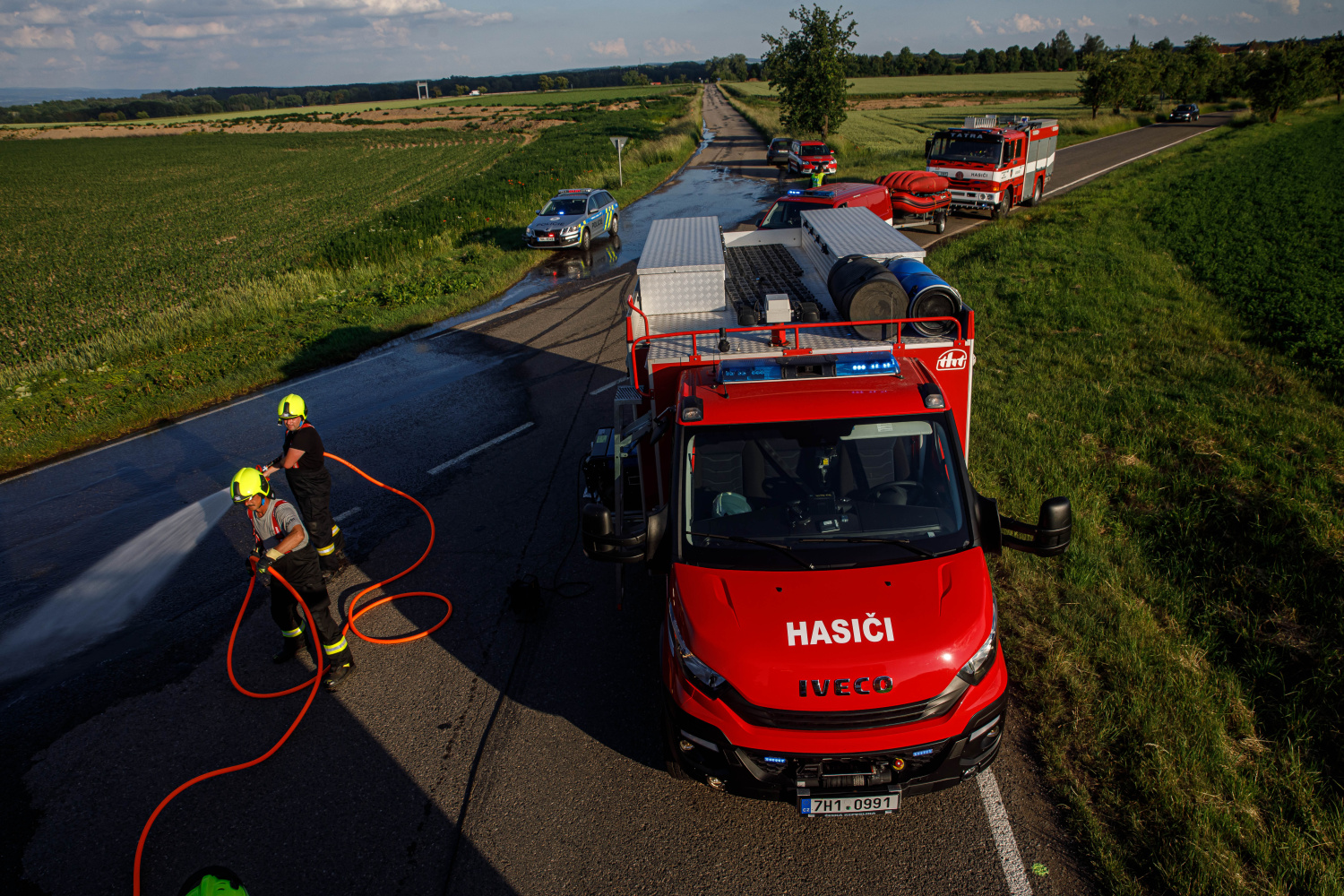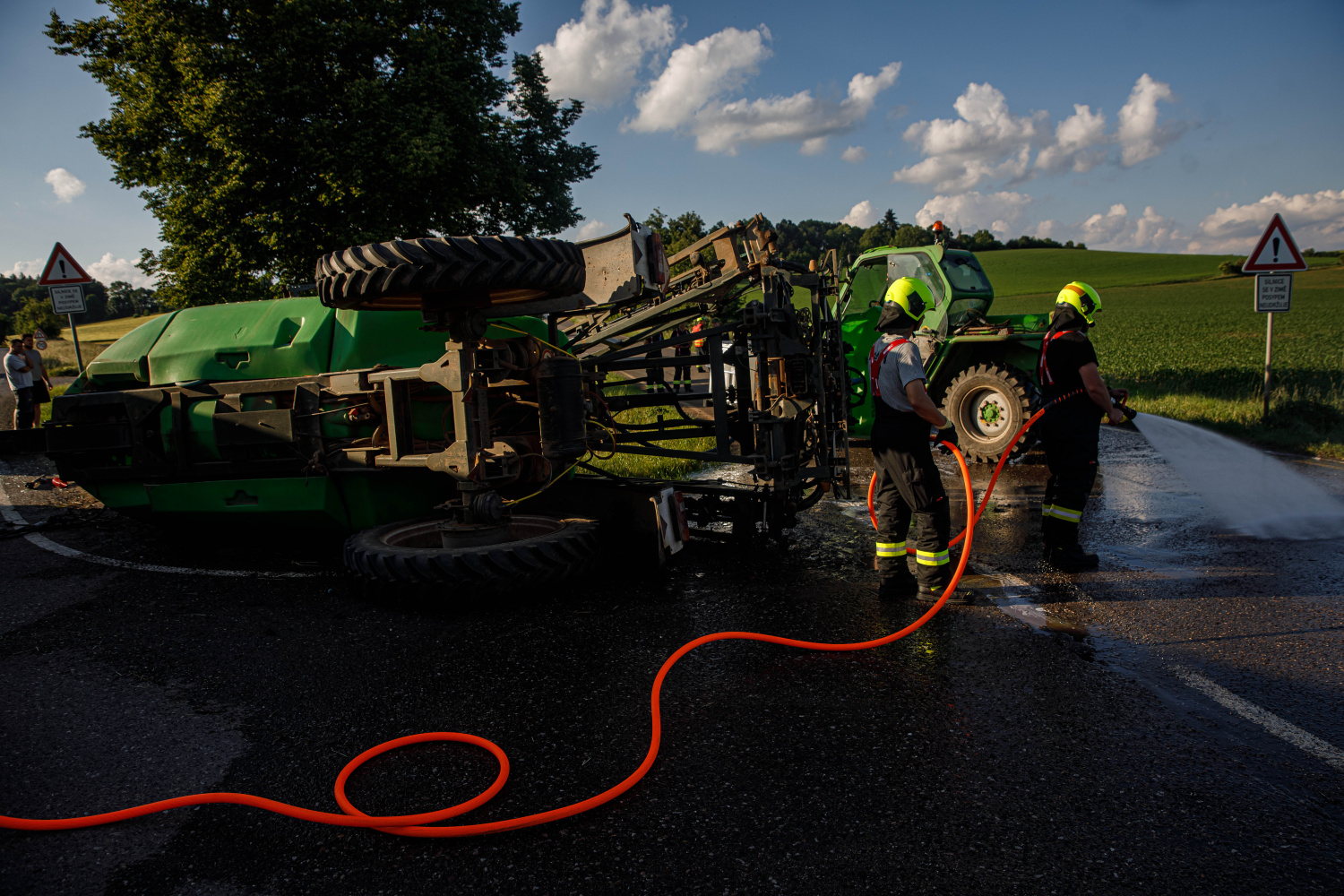 Ve večerních hodinách zasahovaly jednotky požární ochrany u dopravní nehody postřikovače, který se převrátil na komunikaci u Dolan (okr. NA). Ze stroje, který skončil na boku, vyteklo větší množství přípravku na ochranu rostlin v koncentraci určené na postřik. O úniku přípravku do okolního prostředí byli vyrozuměni zástupci orgánů ochrany přírody. Jednotky po dohodě s nimi kapalinu uniklou na komunikaci ředily vodou a dále přečerpávaly zbytek látky z nádrže. Po přečerpání zbytku obsahu postřikovače vrátili hasiči stroj pomocí vyprošťovacího automobilu s jeřábem zpět na kola.