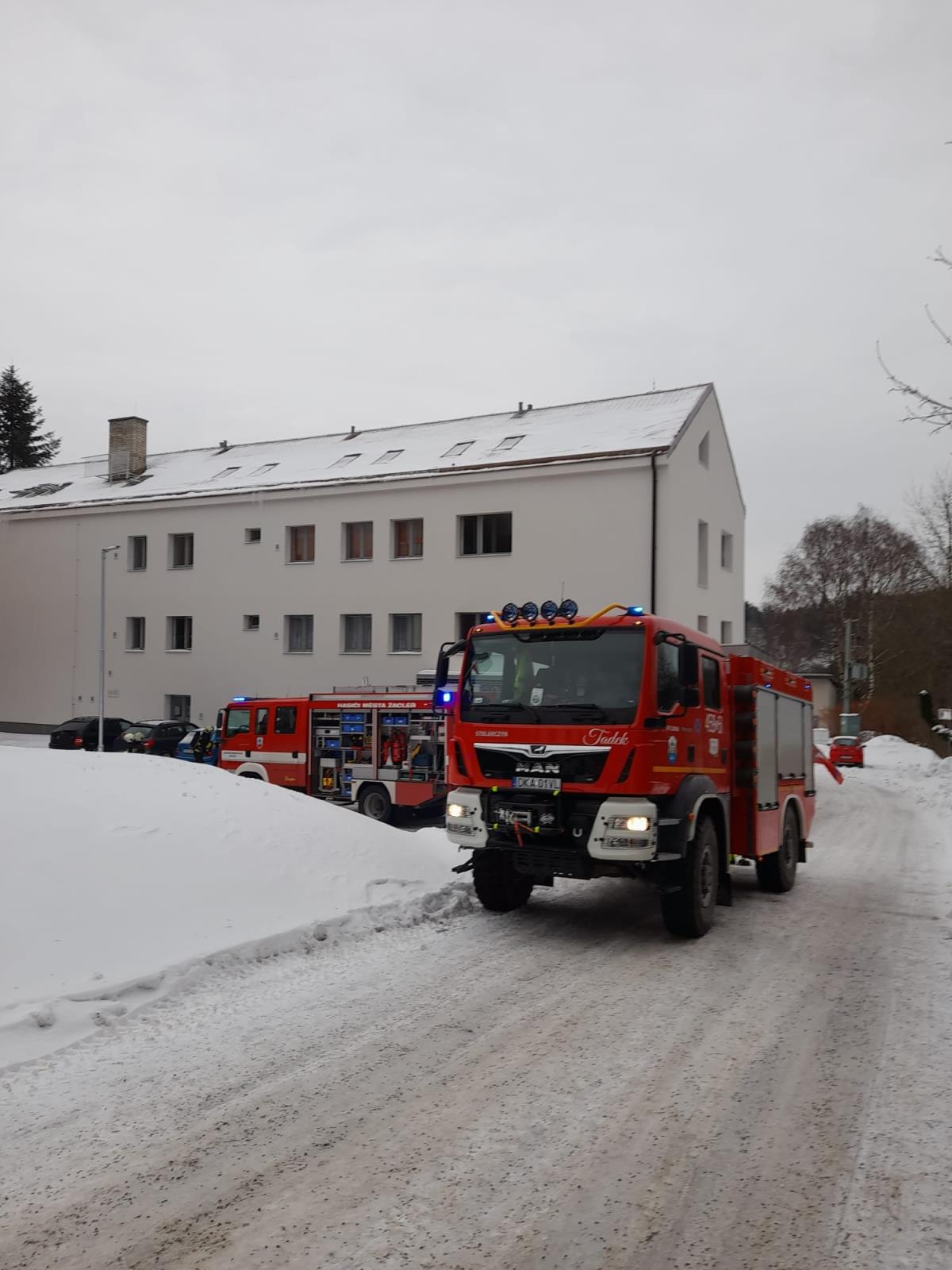Hned několika jednotkám hasičů byl vyhlášen poplach v pondělí odpoledne, na tísňovou linku přišlo oznámení o požáru v bytovém domě v ulici Ml. horníků. Průzkumem bylo zjištěno, že došlo k zahoření ve sklepních prostorách bytovky. Chodby pak zahltil hustý kouř a někteří obyvatelé tak zůstali uvězněni ve svých bytech. Část hasičů prováděla hasební zásah ve sklepě domu, další se pak zaměřili na záchranu osob z bytových jednotek. V koši automobilového žebříku nebo pomocí vyváděcích masek bylo evakuováno celkem 18 lidí a jeden pes. Událost se obešla bez zranění. Po dobu zásahu byla na místě také zdravotnická záchranná služba.