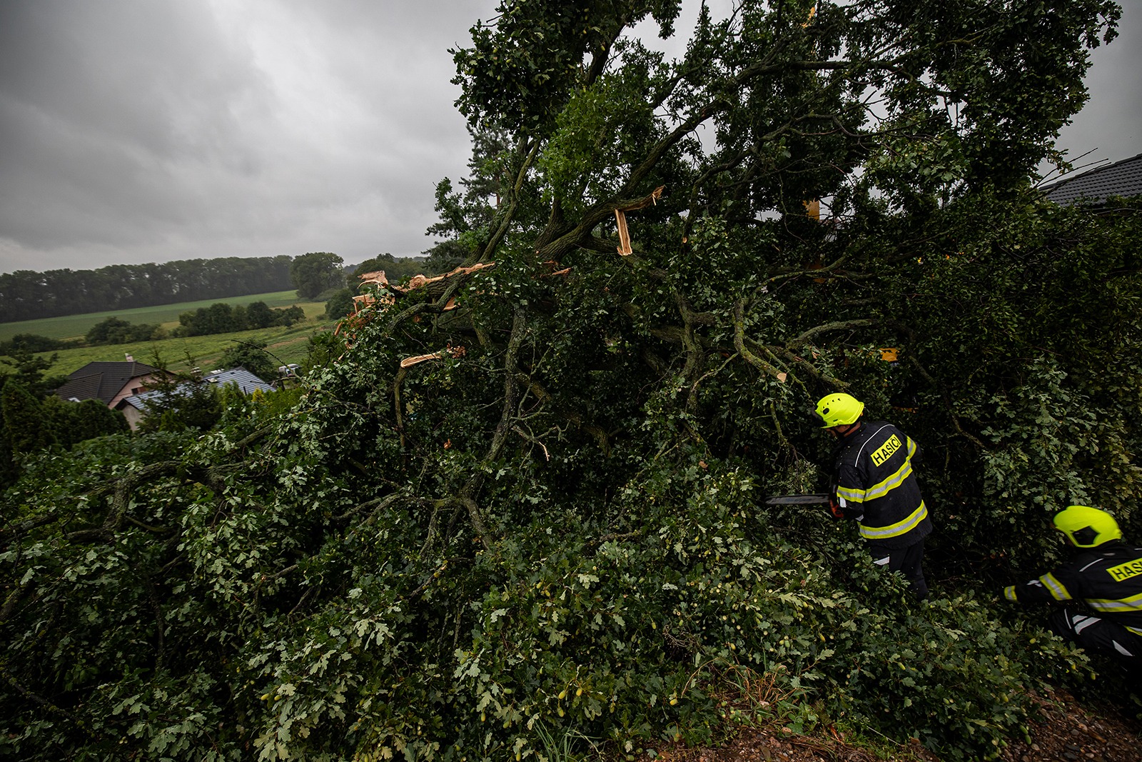 V obci Náhořany došlo k pádu stromu na jeřáb. Hasiči provedli odstranění stromu z přistavené výškové techniky.