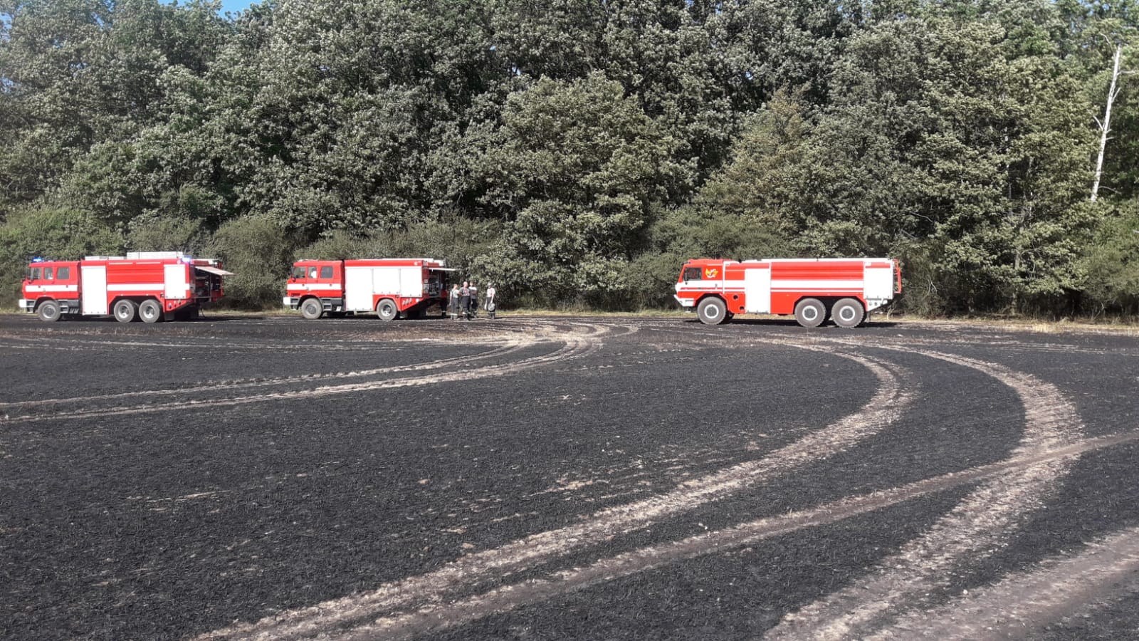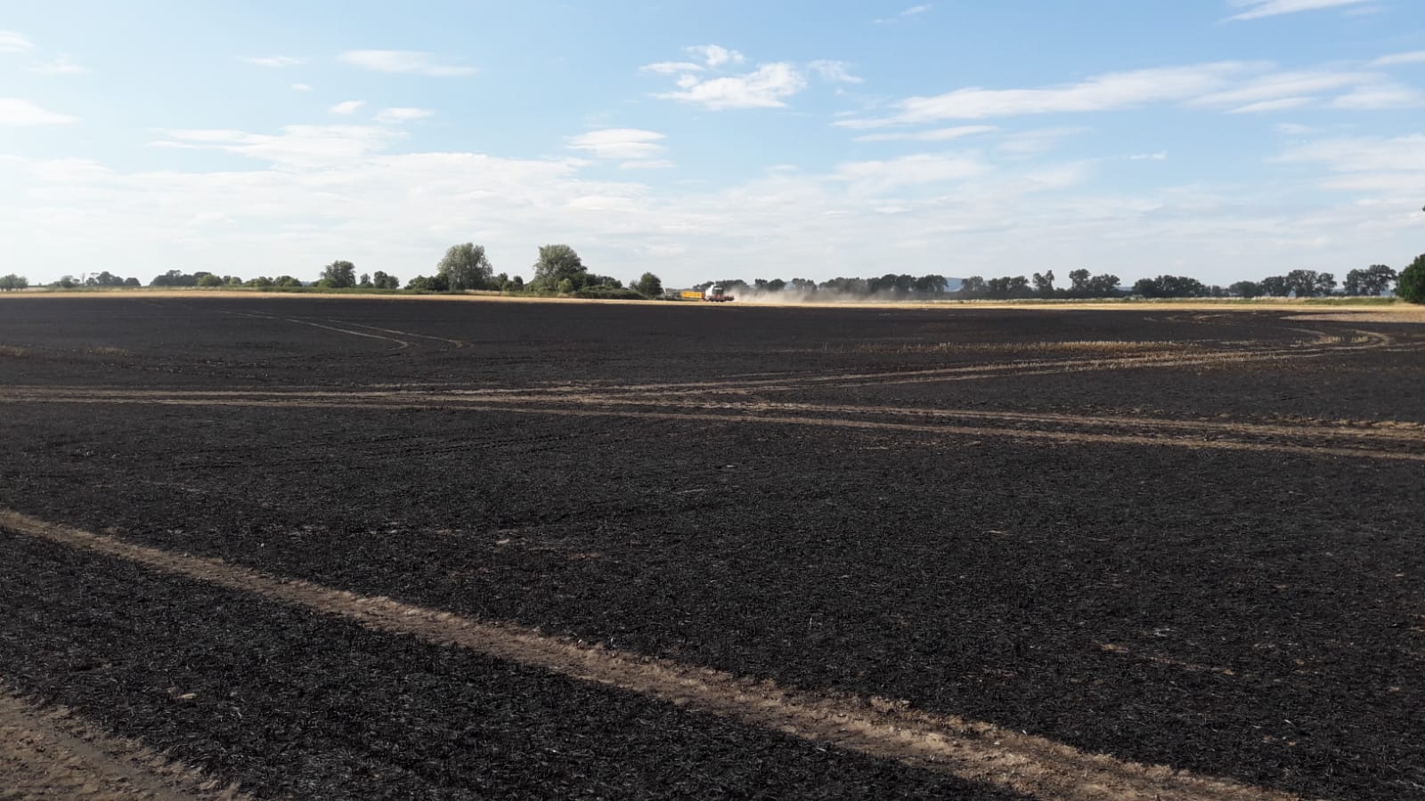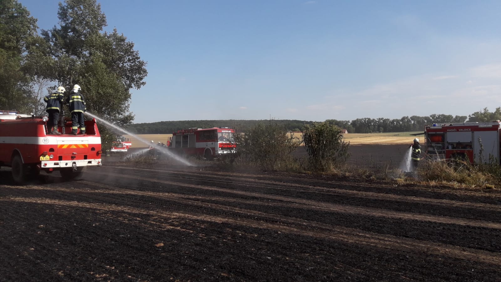 Hlášení o dalším požáru v krátké době za sebou přijalo krajské operační a informační středisko těsně po 15:30 hod. Hořelo posekané pole, přičemž se plameny rozšířily na plochu 1000x500 m. Postupně byl vyhlášen 3. stupeň požárního poplachu, na místě události se sjelo celkem 14 jednotek požární ochrany. Požár se podařilo jednotkám lokalizovat kolem 16:30 a likvidaci události ohlásil velitel zásahu v 17:07 hod. O požáru byly vyrozuměny také orgány ochrany životního prostředí. Kouř z pole byl cítit i na několikakilometrovou vzdálenost, nikoho však neohrožoval. Vzhledem k tomu, že se jednalo o požár již posekaného strniště, byla škoda nulová. Hořet začalo pravděpodobně od mechanické jiskry od lišty kombajnu.