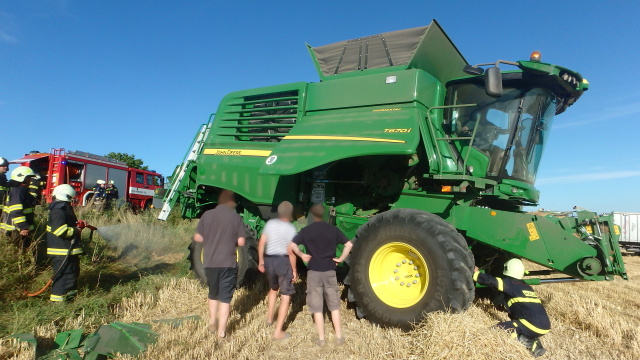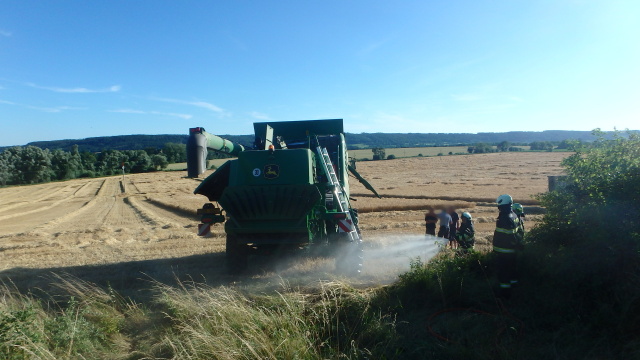 Pět jednotek hasičů bylo zalarmováno kvůli nahlášenému požáru zbytků slámy v lapači kamenů kombajnu značky John Deere. Požár začala likvidovat obsluha stroje pomocí přenosných hasicích přístrojů, po svém příjezdu pak hasiči prolili lapač a ochlazovali místa předchozího zahoření. Příčinou vzniku požáru bylo vznícení obilného prachu a zbytků slámy jiskřením vniknutých kamenů do lapače. Požár naštěstí nenapáchal žádnou škodu. Na místě zasahovali profesionální hasiči ze Dvora Králové nad Labem a Jaroměře, poplach byl vyhlášen také JSDH Choustníkovo Hradiště, Žireč a Kuks.
