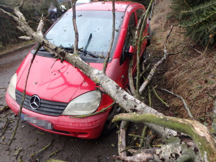 Odstranění stromu, který spadl v ulici U Stříbrného potoka na osobní automobil. Při události nebyl nikdo zraněn. (HZS Náchod)