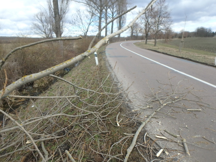 Odstranění stromu, který hrozil pádem na silnici č. 299 mezi Třebechovicemi p. O. a Libranticemi. (JSDH Třebechovice pod Orebem, HZS Hradec Králové)