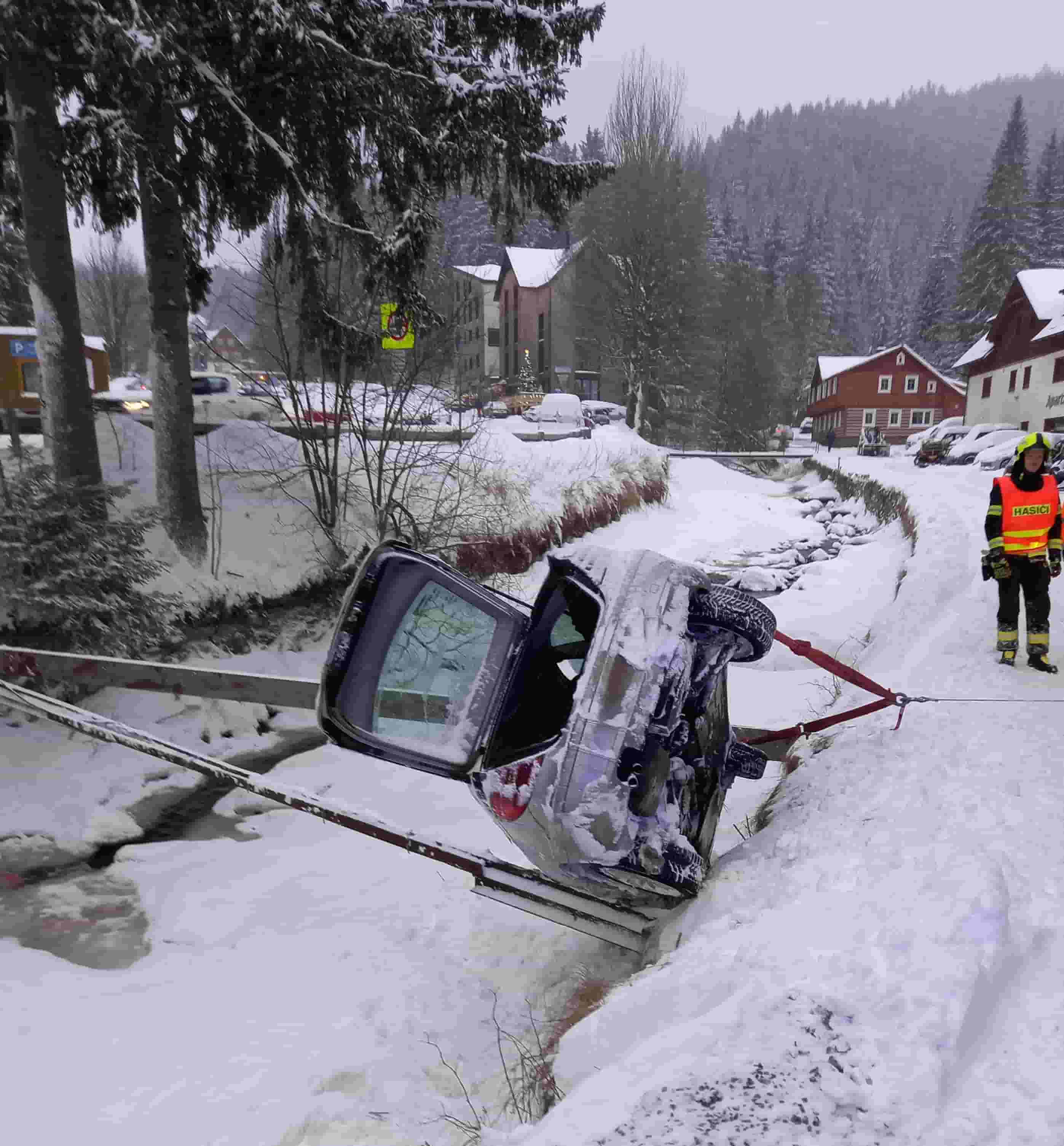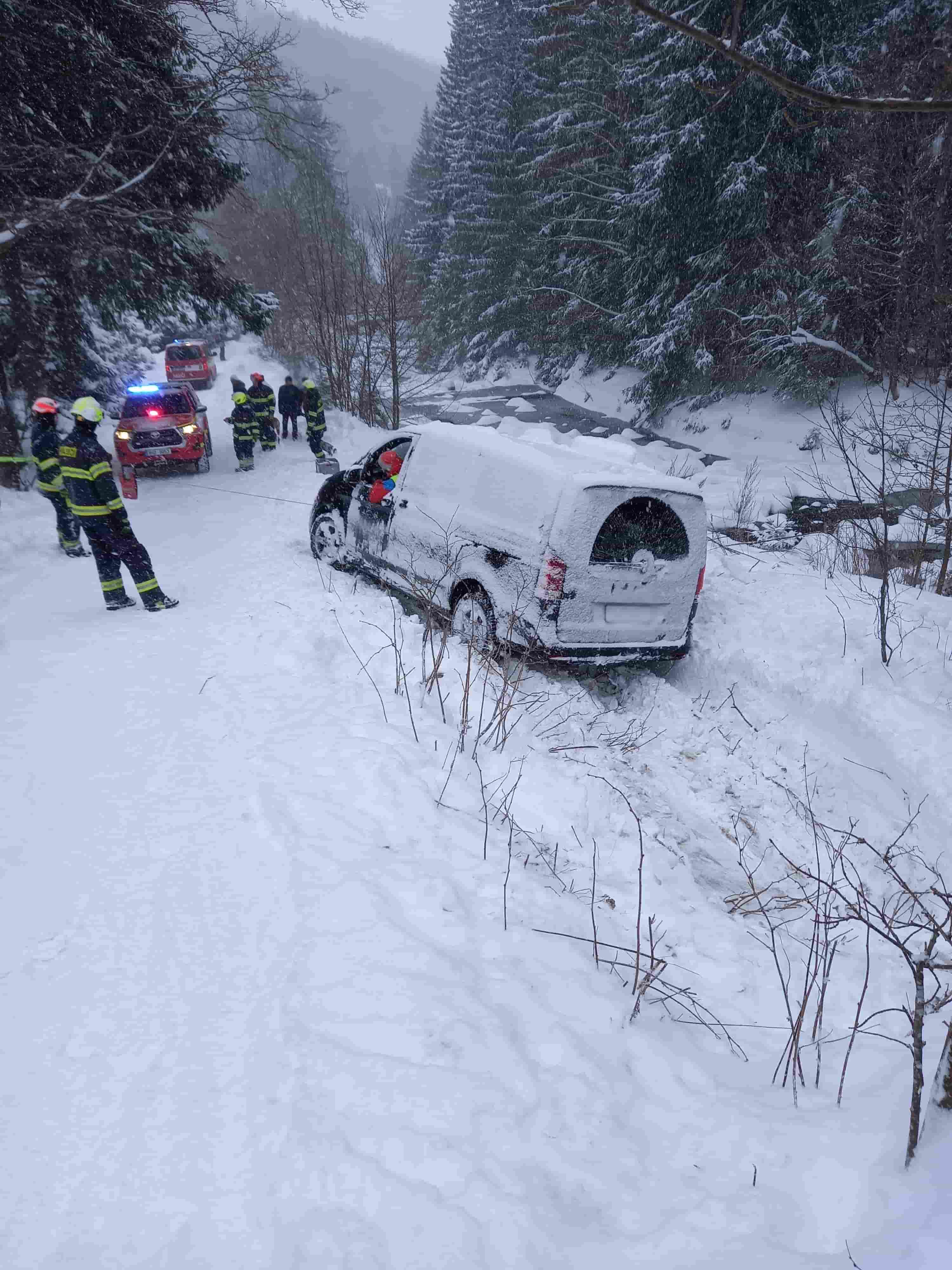 Zimní podmínky v horských oblastech přinesly během dne výrazné komplikace v dopravě. Hasiči zasahovali u řady nehod, při nichž skončila vozidla v příkopech i v korytech řek. Několik osob utrpělo zranění.