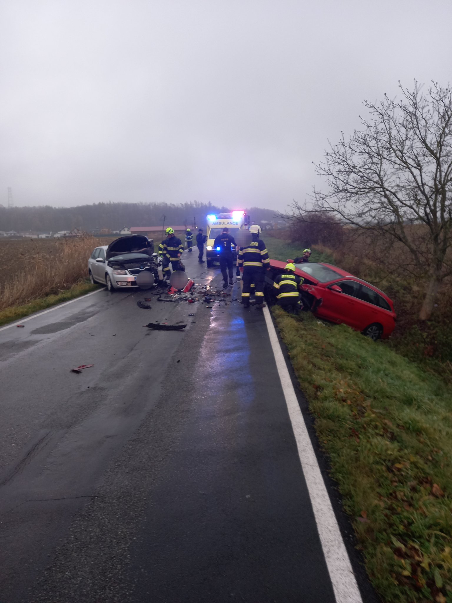Srážka dvou aut uzavřela silnici. Hasiči zasahovali a uklízeli následky