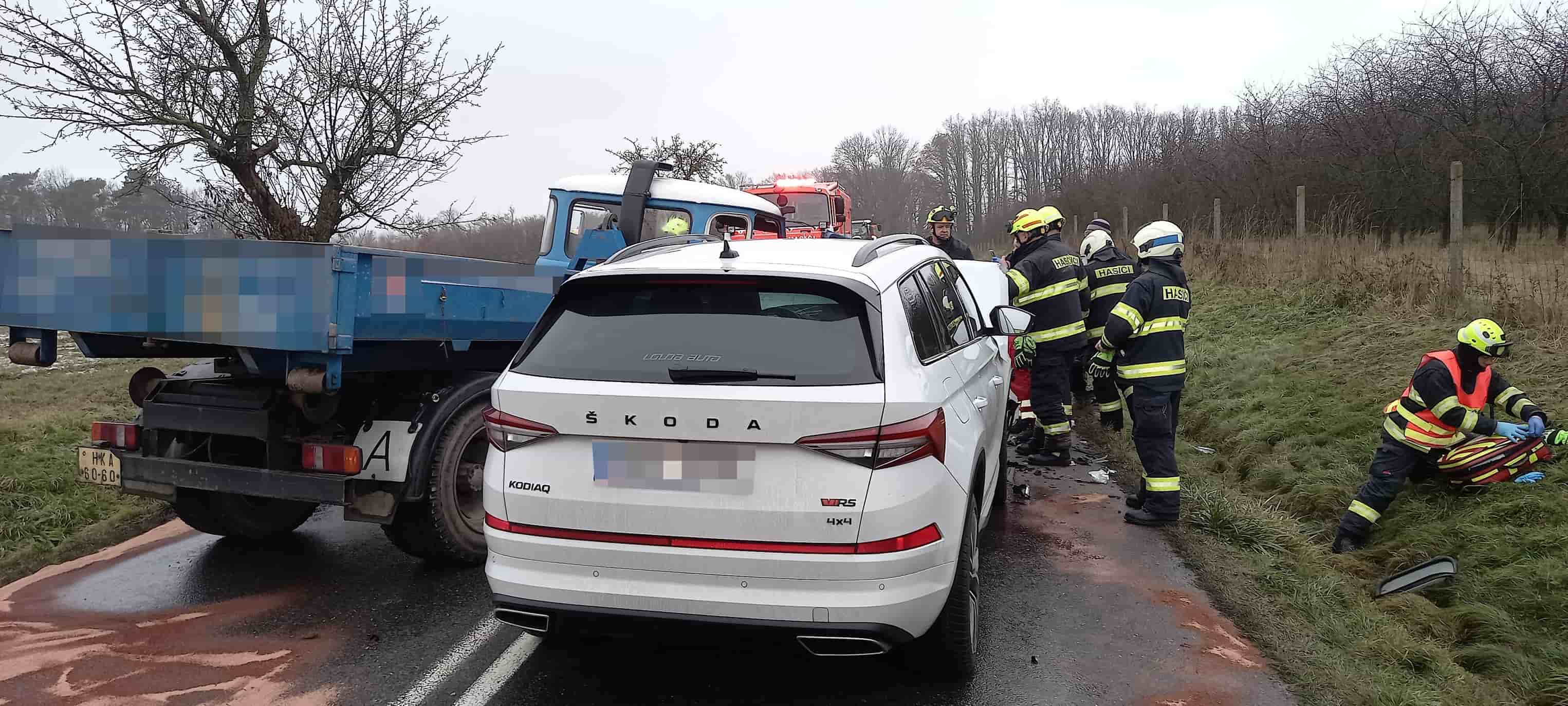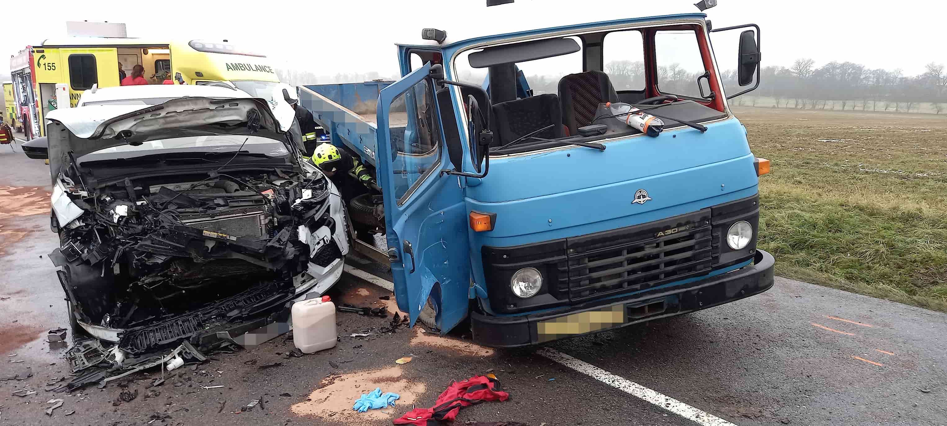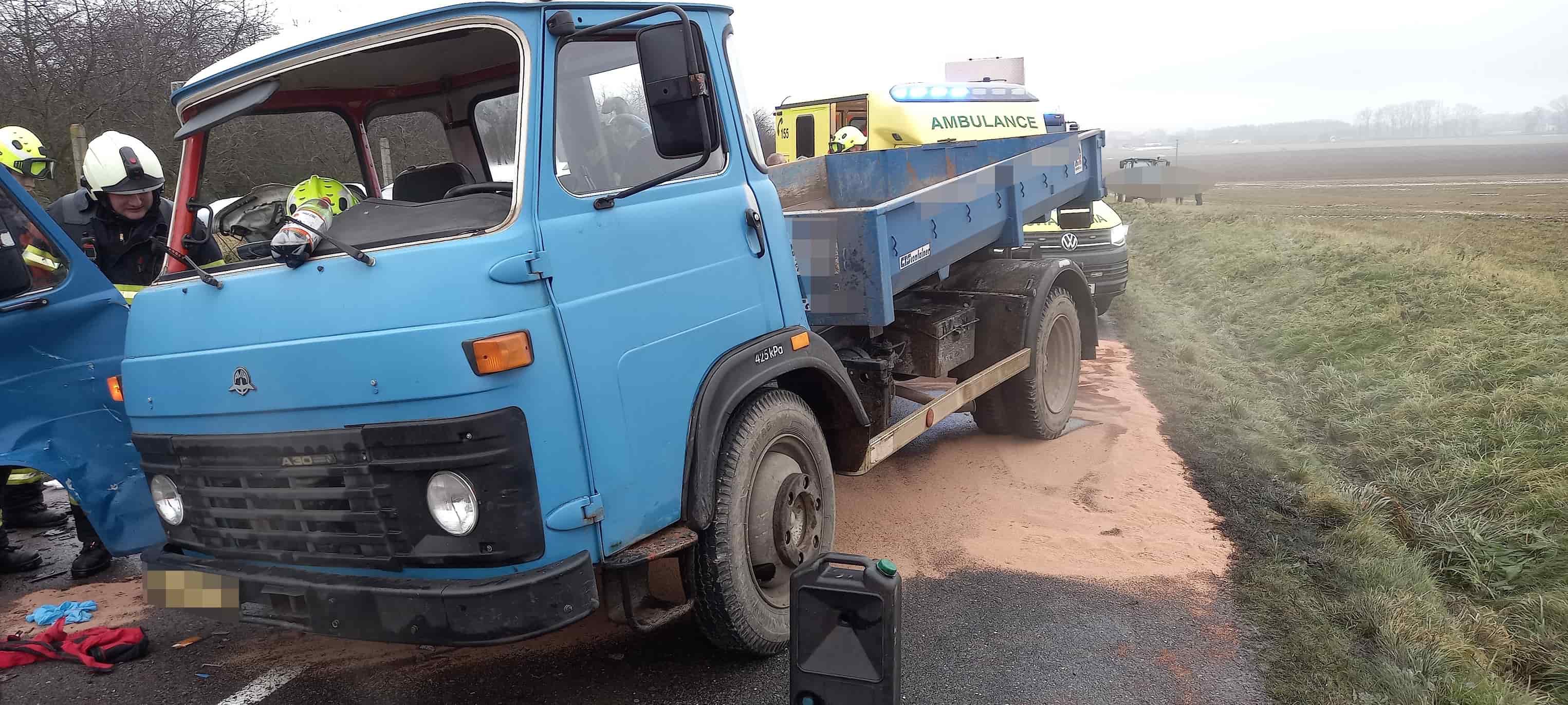 Srážka osobního auta s nákladním vozidlem: Dvě zranění a ekologické riziko