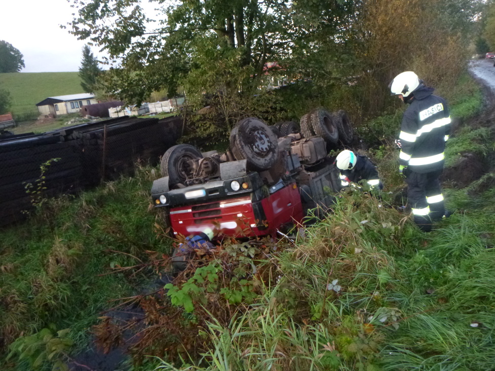 V trativodu a převrácené na střechu, tak skončilo nákladní vozidlo značky Tatra po dopravní nehodě v Nádražní ulici v Pilníkově. Řidič vyvázl z vozidla bez zranění, náklad (štěrk s hlínou) se však vysypal. Zároveň došlo k menšímu úniku pohonných hmot. Na místě zasahovali profesionální hasiči ze stanice Trutnov. Protože se v blízkosti nacházel potok, nasadili hasiči na vodu sorpční hady, aby případný únik zachytili. Na místě byla také speciální vyprošťovací technika a technický chemický automobil z trutnovské stanice, ale vyproštění havarované Tatry musela zajistit odborná firma. Hasiči zůstali na místě, aby asistovali při vyproštění auta a také pro případ, že by došlo k dalšímu úniku provozních náplní. Po 21. hodině se jednotka vracela zpět na základnu.