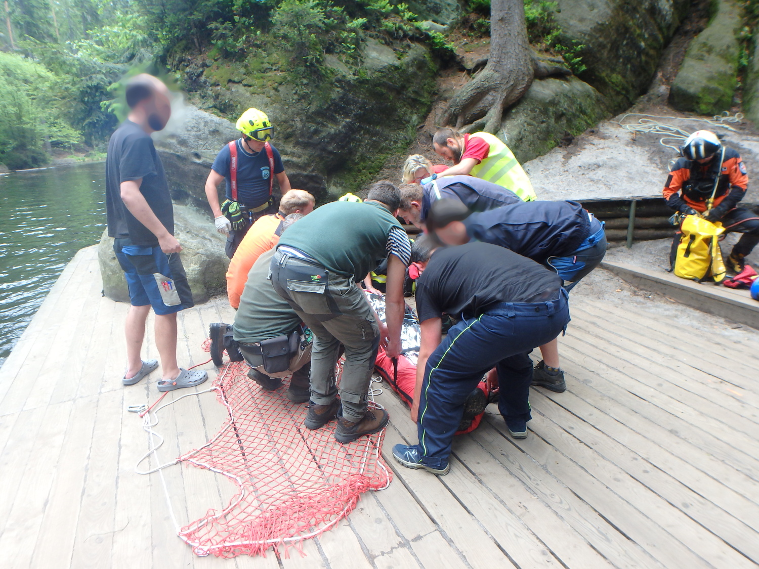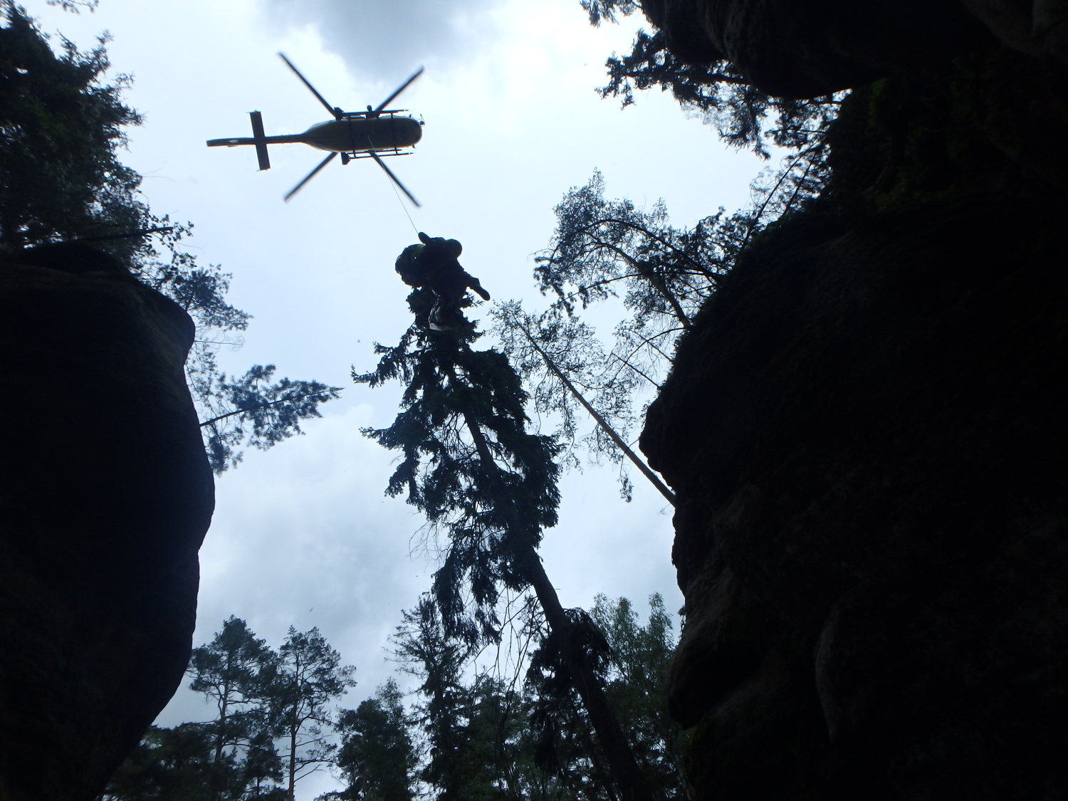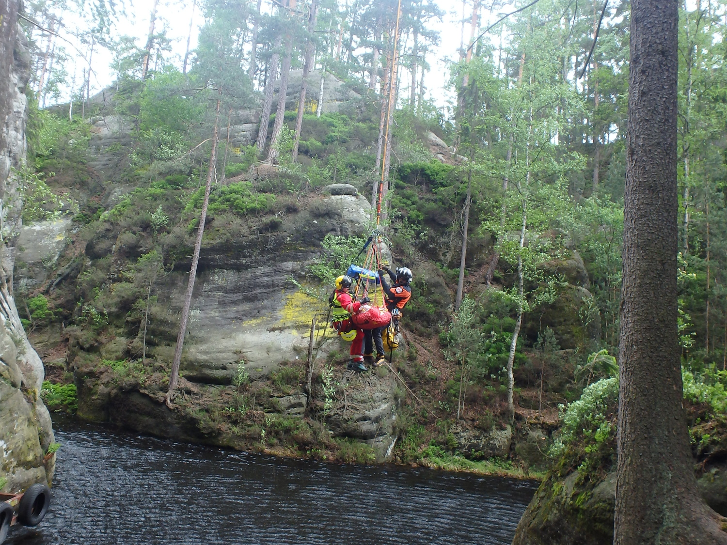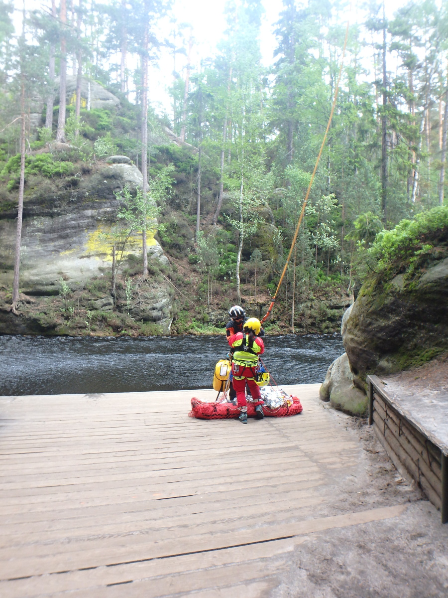 K záchraně osoby, která měla zdravotní potíže, vyráželi hasiči a zdravotničtí záchranáři ZZS KHK včetně vrtulníku LZS do oblasti Horního Adršpachu. Komplikací bylo, že se člověk nacházel pro techniku v nedostupném terénu Adršpašských skal u Adršpašského jezírka na nástupní ploše na pramice. Na místo byli vysláni kromě posádky ZZS také dobrovolní hasiči z Adršpachu a profesionální ze stanice Trutnov. I kvůli náročnosti okolního terénu bylo rozhodnuto, že pacienta vyzvedne v místě vrtulník letecké záchranné služby pomocí lanového podvěsu. Osobu zajistili a připravili záchranáři ve spolupráci s hasiči, na nástupní plochu se pak pomocí proměnného podvěsu slanil letecký záchranář HZS spolu s lékařkou ZZS. Zajištěného pacienta ve vakuové matraci a transportní síti pak v 50m podvěsu transportovali na bezpečné místo k dalšímu ošetření.