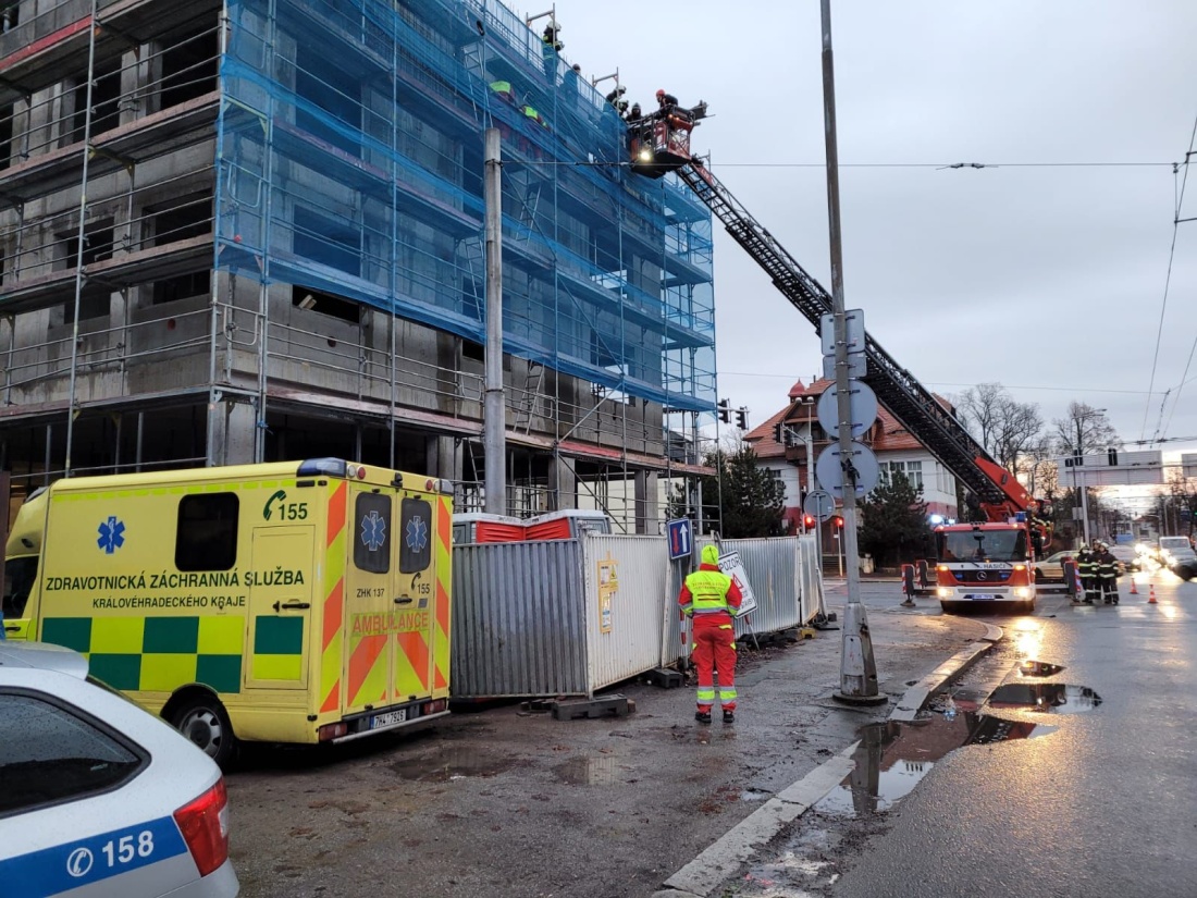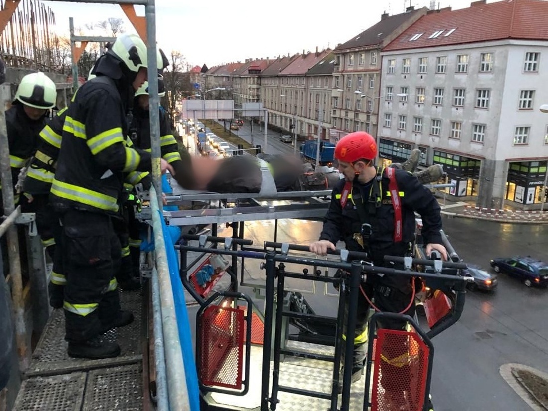 Do Střelecké ulice mířili profesionální hasiči z centrální stanice, na postaveném lešení na stavbě se měl nacházet člověk se zdravotními potížemi. Posádka zdravotnické záchranné služby pacienta ošetřila a zajistila, hasiči poté transportovali zraněnou osobu pomocí automobilového žebříku dolů na zem k sanitnímu vozu.