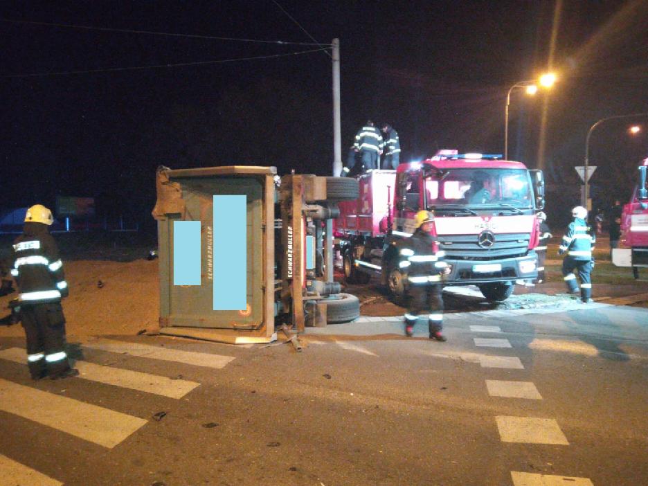 Profesionální hasiči z centrální stanice Hradec Králové vyjeli ve středu 10.10. krátce před třetí hodinou noční ke střetu osobního automobilu a kamionu. Nehoda se stala na křižovatce ulic Sokolská a Hradecká.Nákladní vůz skončil převrácený na boku. Hasiči poskytli zraněnému řidiči předlékařskou pomoc. Poté jej předali do péče zdravotnické záchranné služby, která jej převezla do nemocnice.