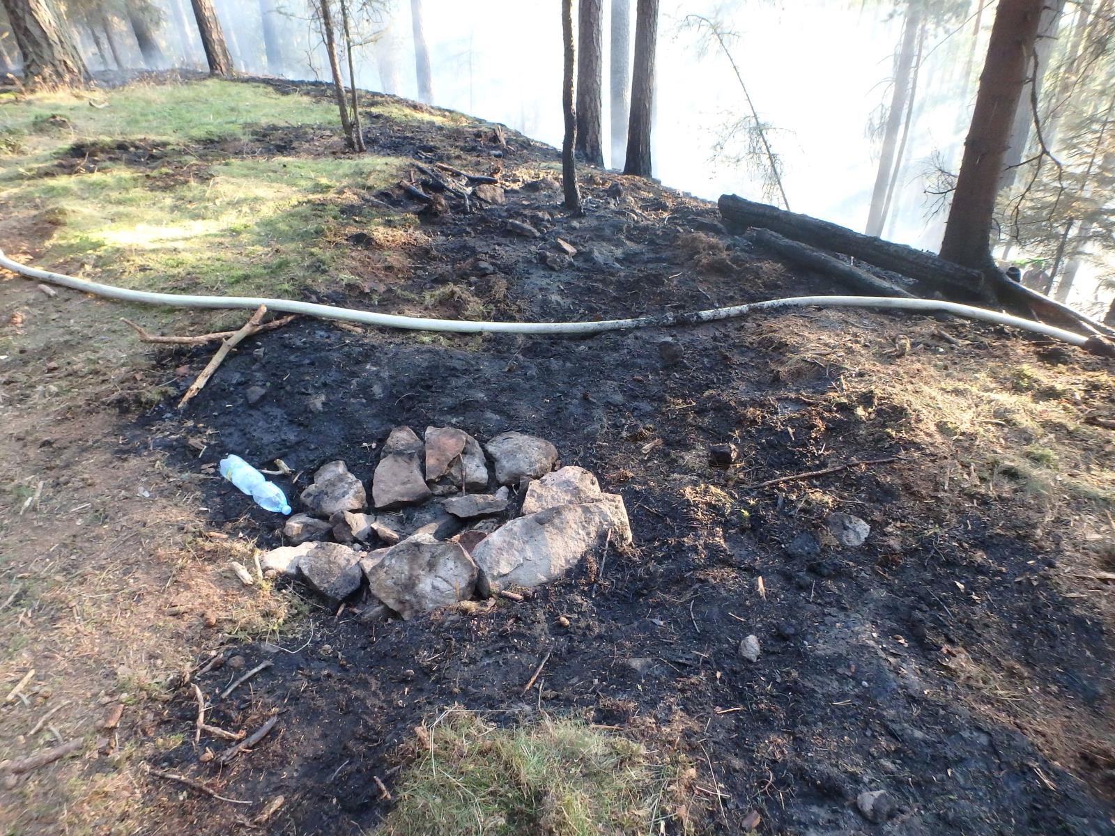 Místo požáru bylo obtížné nalézt a terén pro příjezd hasičské techniky byl náročný. Po příjezdu na místo bylo zjištěno, že hoří suchá tráva, lesní hrabanka a jehličnaté podúrovňové stromy ve vysokokmenném lese. Požárem byly zasaženy též spodní části kmenů jehličnatých stromů (borovice, modříny, smrky atd.). Jednotkám se podařilo požářiště obehnat a začaly postupně okopávat okolní půdu, aby se nemohl oheň rozšířit dál.