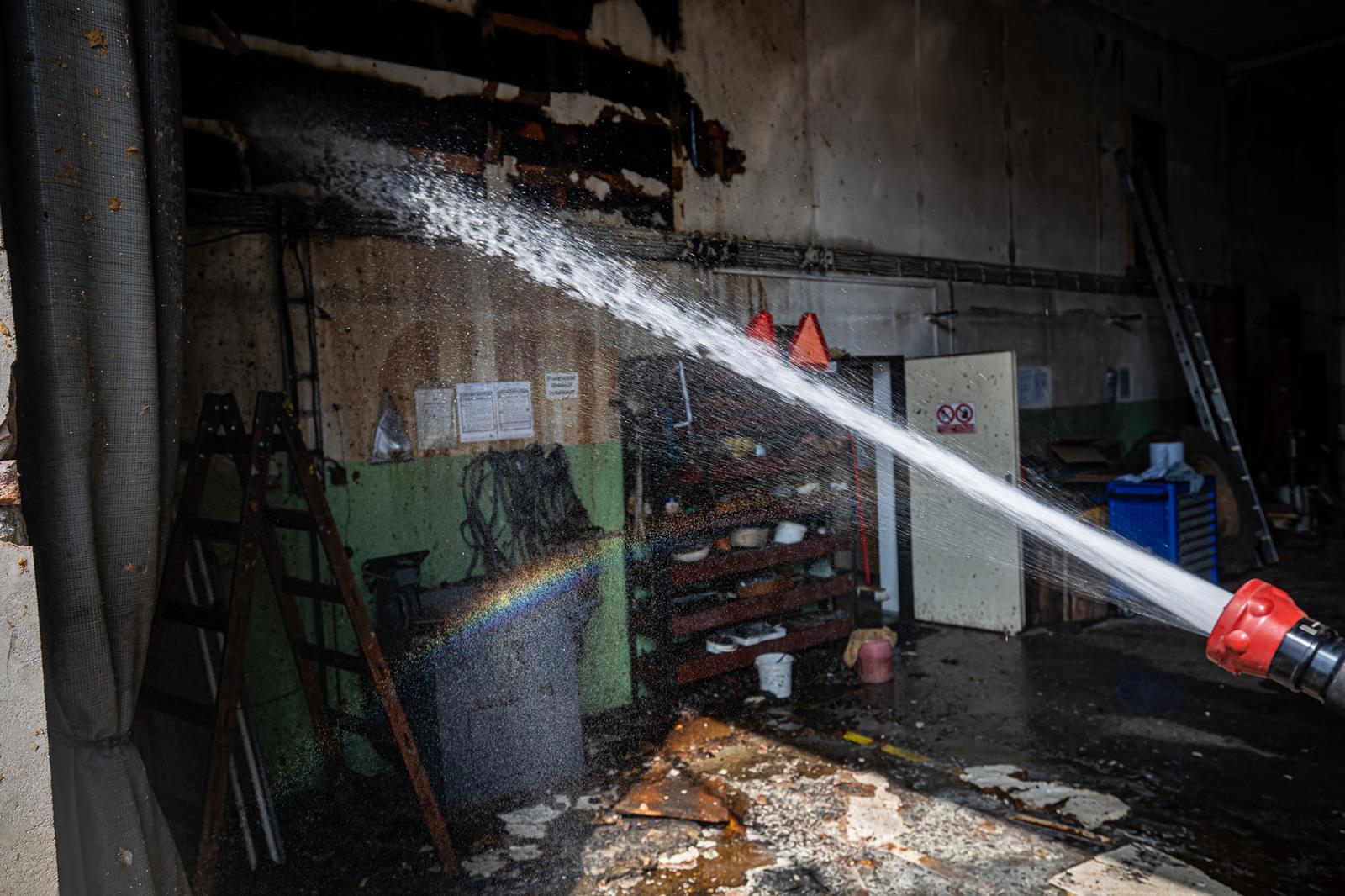 Hasiči ihned při příjezdu zahájili hašení zevnitř haly i z venku. Rychle se jim tak podařilo požár lokalizovat. Průzkumem pomocí termokamery byla pak postupně vyhledána skrytá místa hoření v mezistropu, který musel být částečně rozebrán. Požár byl zlikvidován v 14:36 hod. a na místě zůstala místní jednotka SDH Svinary k zajištění dohlídky.
