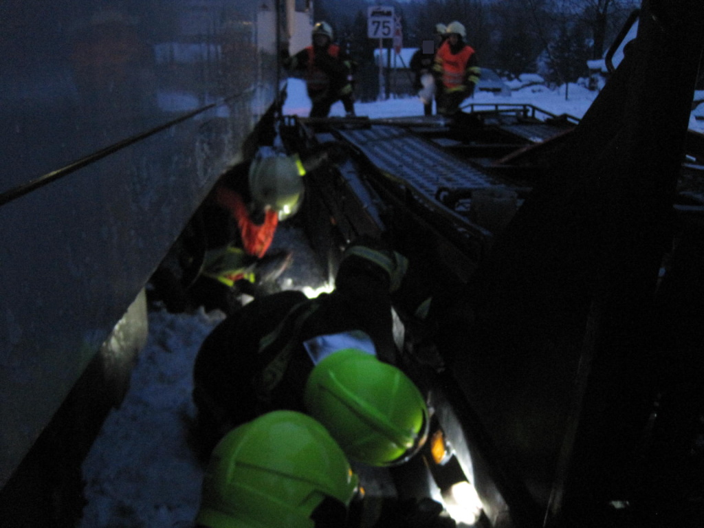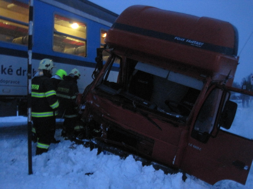 K další železniční nehodě došlo v pátek odpoledne u obce Chotěvice na Trutnovsku. Na železničním přejezdu se střetl osobní vlak s nákladním vozidlem. I v tomto případě se nehoda obešla bez zranění. Na místo události vyjeli v 16:27 hodin profesionální hasiči z Trutnova, dobrovolní hasiči z Hostinného a hasiči HZS podniku Správy železniční dopravní cesty Nymburk. Ti po příjezdu na místo zkontrolovali řidiče nákladního auta, který vystoupil ještě před srážkou. Stejně tak strojvedoucí vlaku opustil kabinu ještě před nárazem. Ve vlaku cestovalo zhruba 25 lidí, kteří bezpečně vystoupili a náhradní autobusovou dopravu přejeli na nejbližší železniční stanici. Hasiči jímali a přečerpali zhruba 200 litrů nafty z poškozené nádrže nákladního automobilu. Královéhradečtí hasiči následně předali místo události drážním hasičům a vrátili se zpět na své základny. Po zadokumentování události byl nákladní vůz vyproštěn a odstraněn z profilu trati. (foto: stanice Trutnov)
