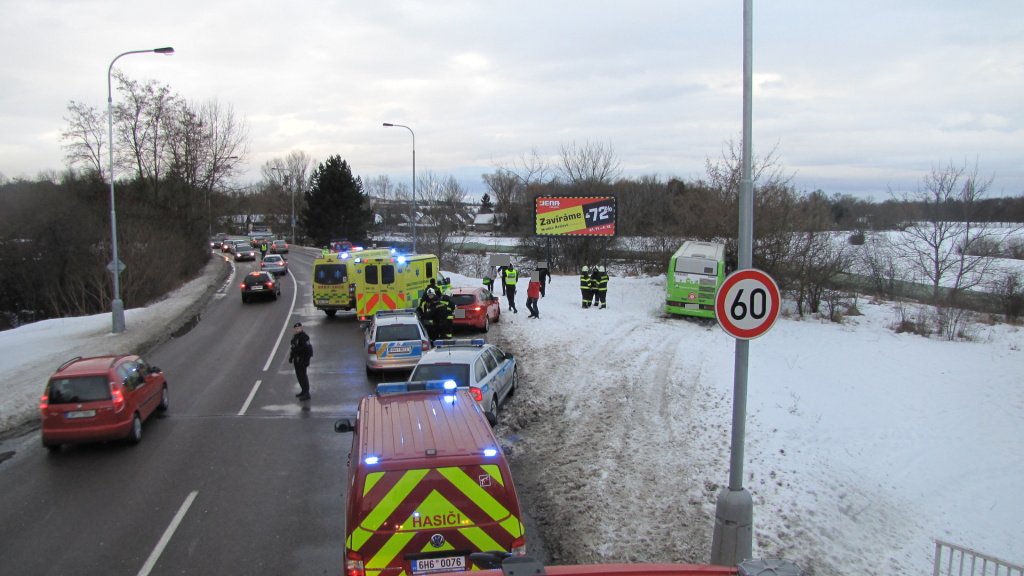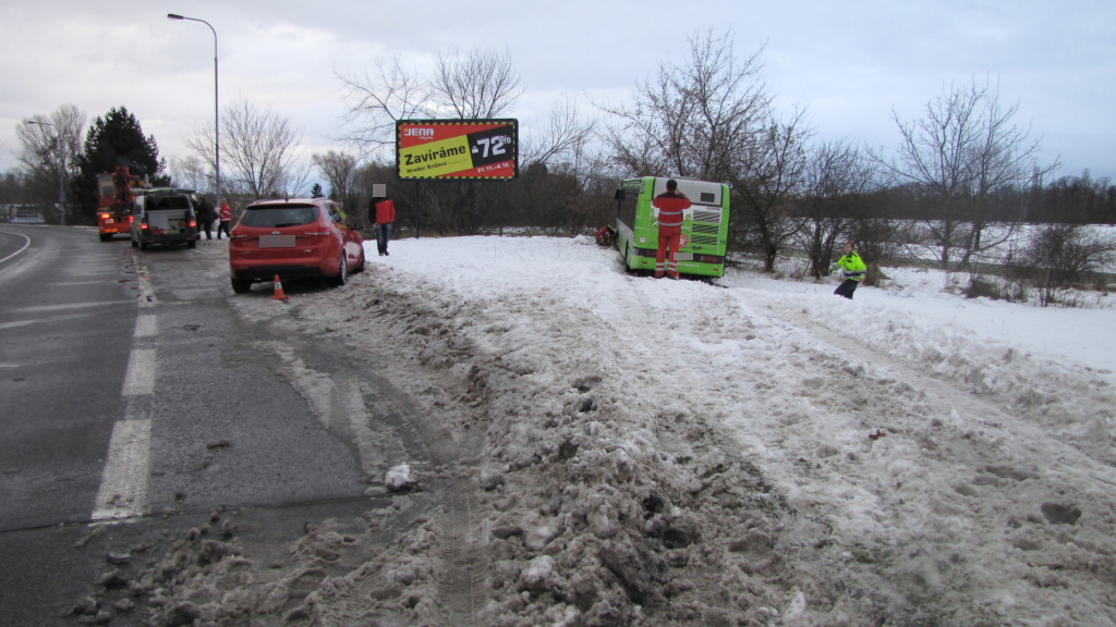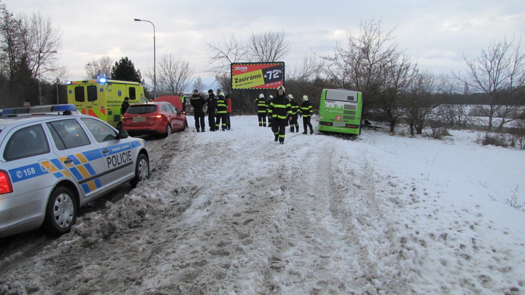 Na Jičínsku jednotka profesionálních hasičů z Hořic pomáhala řidiči autobusu, který sjel do příkopu v Lukavci u Hořic. Kvůli množství sněhu zůstaly dveře autobusu zablokovány a šest cestujících i s řidičem se nemohli dostat ven. Hasiči odházeli sníh od dveří a pomohli všem bezpečně vystoupit. Nikdo z cestujících nebyl při nehodě zraněn. Z autobusu došlo z důvodu jeho náklonu k nepatrnému úniku pohonných hmot. Hasiči pomocí navijáku cisterny vyprostili vozidlo zpět na vozovku. (foto: stanice Hořice)