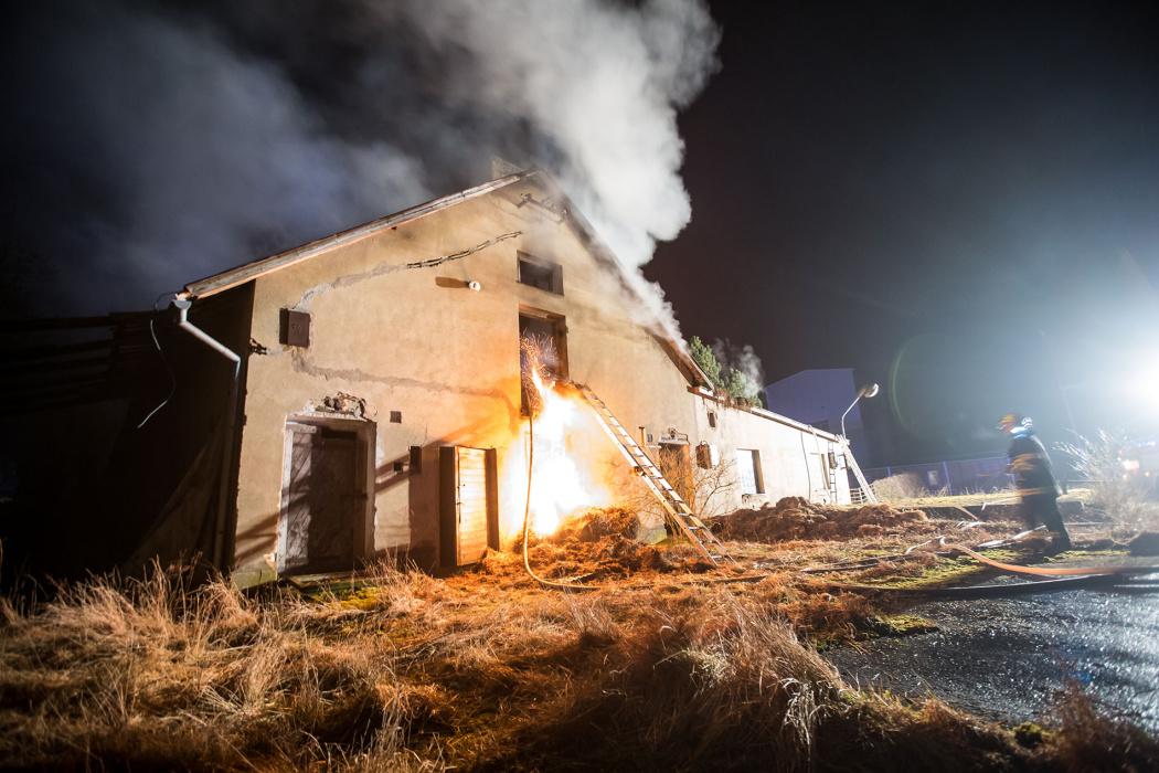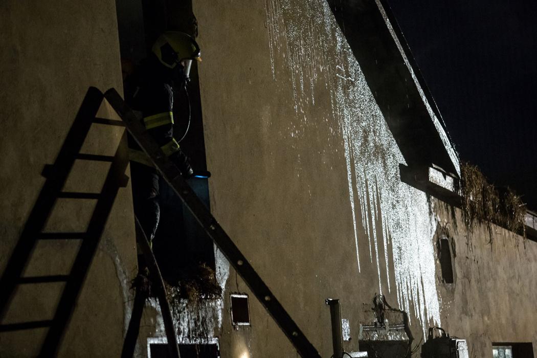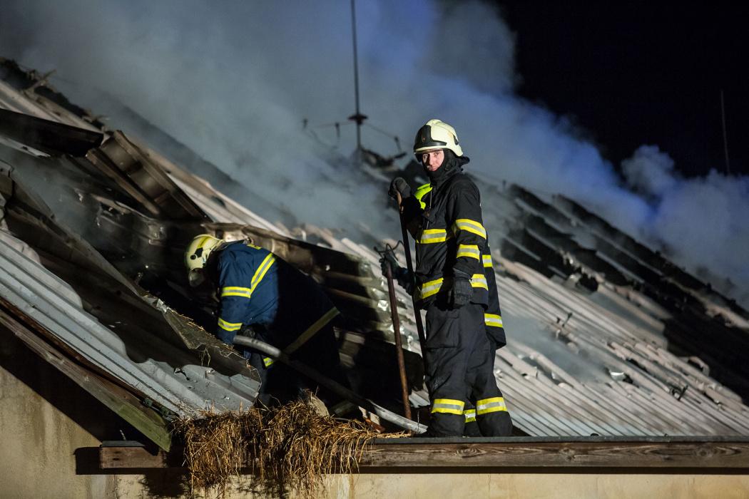 Už při příjezdu jednotek na místo byla požárem zasažena velká část objektu. Jednotky likvidovaly oheň sedmi proudy. V tu dobu byla prohořelá už i střecha objektu na ploše asi 10x60 metrů. Hasičům se podařilo uchránit před požárem vedlejší objekt. Pro odvětrávání byla nasazena přetlaková ventilace. Přímo pod prohořelou střechou pak bylo uskladněno seno. To museli hasiči začít vyhazovat ven a kompletně jej dohašovali až mimo objekt.