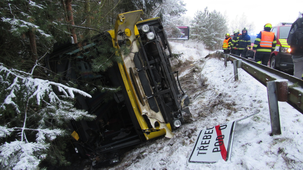 V Třebechovicích pod Orebem havaroval autobus, převrátil se do příkopu, dvě osoby jsou zraněny.