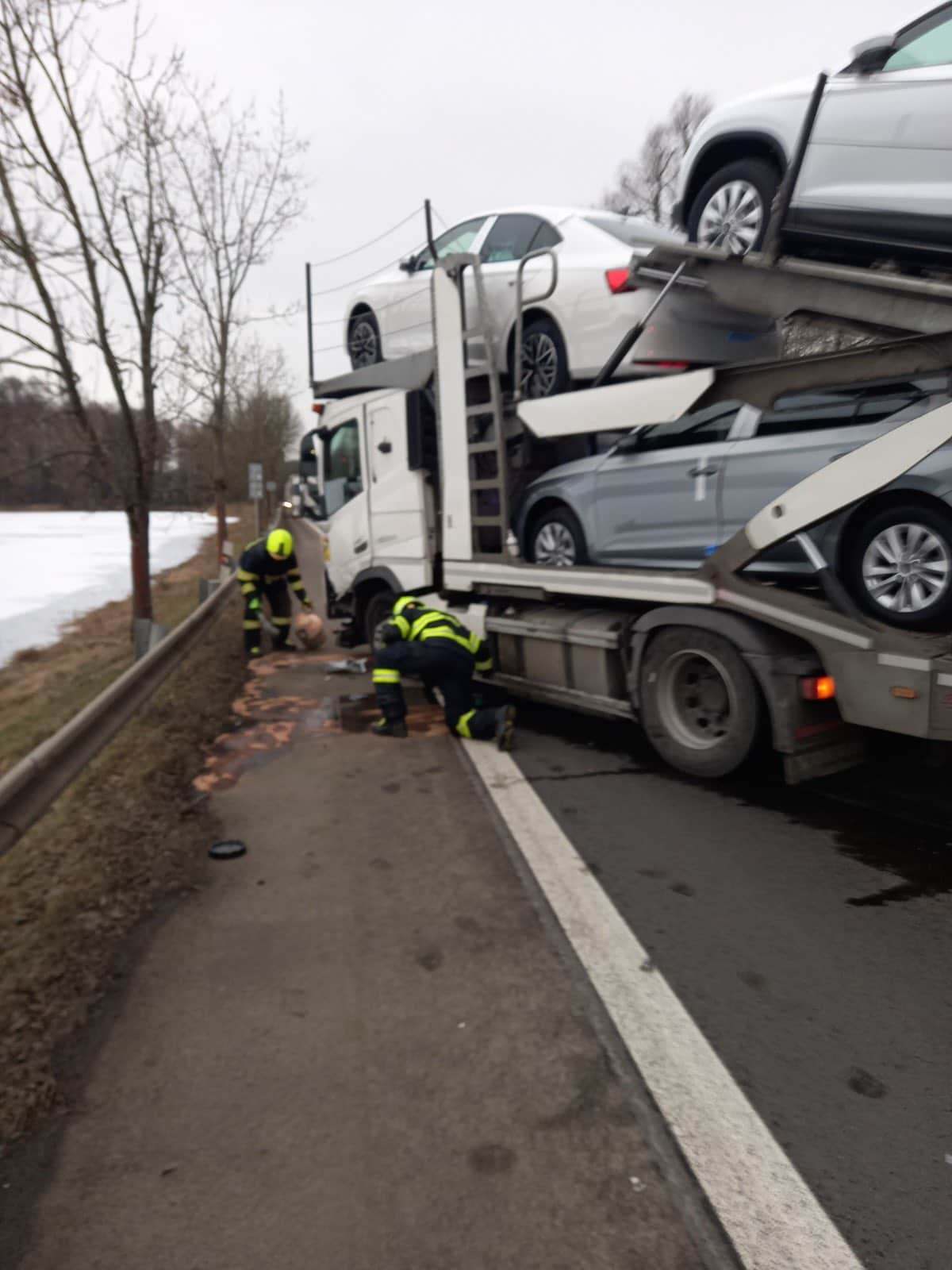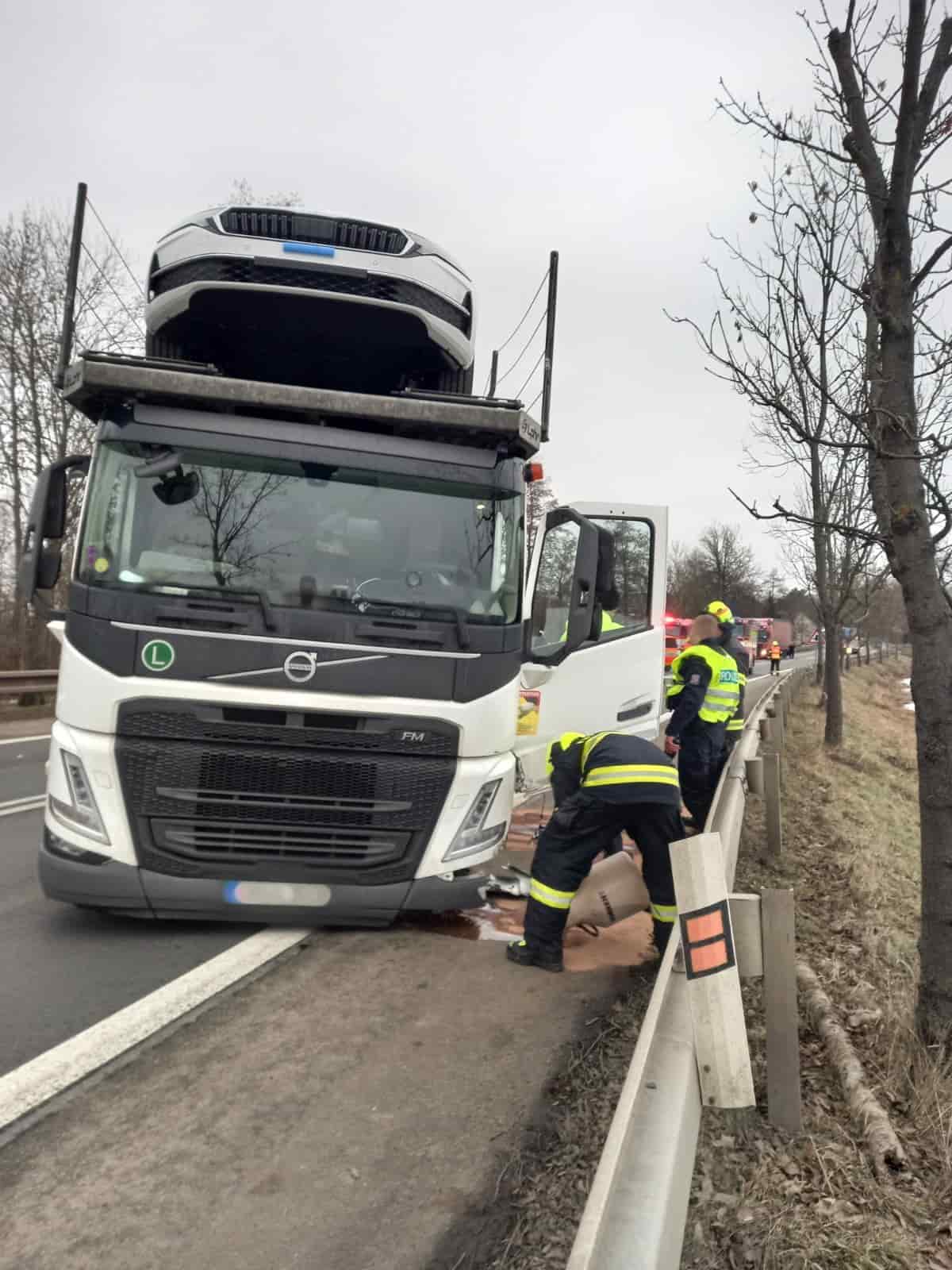 Vážná nehoda kamionu převážejícího auta a osobního vozu přerušila provoz na frekventované silnici. Zraněná osoba byla předána zdravotníkům a hasiči zajistili místo i nebezpečné látky.