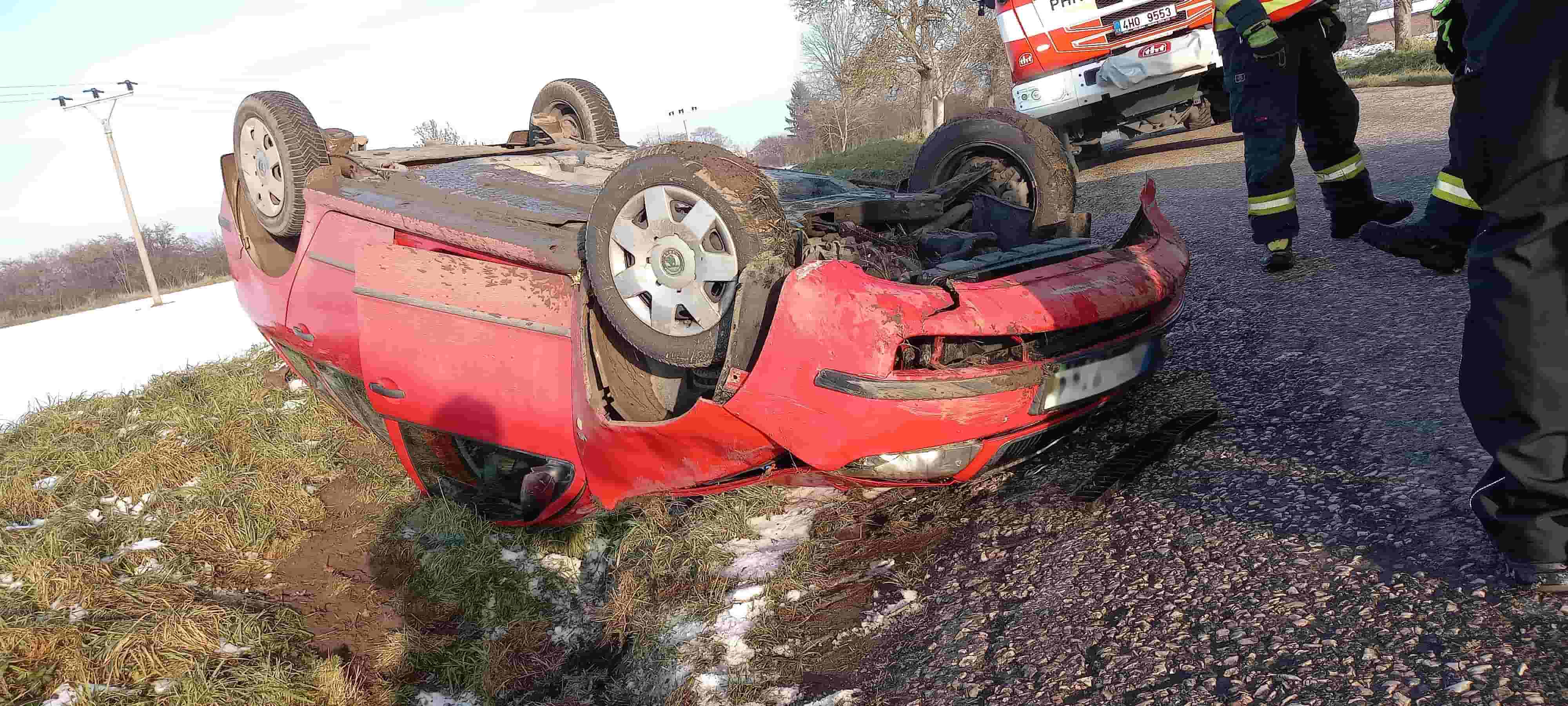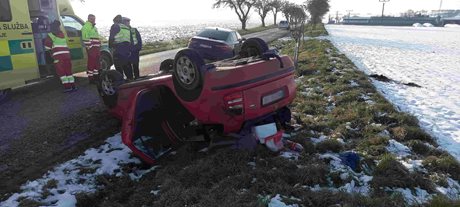 Vážná nehoda osobního vozu: Auto se převrátilo na střechu a jedna osoba skončila v péči lékařů
