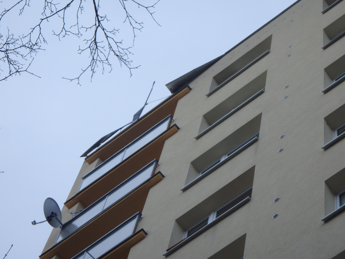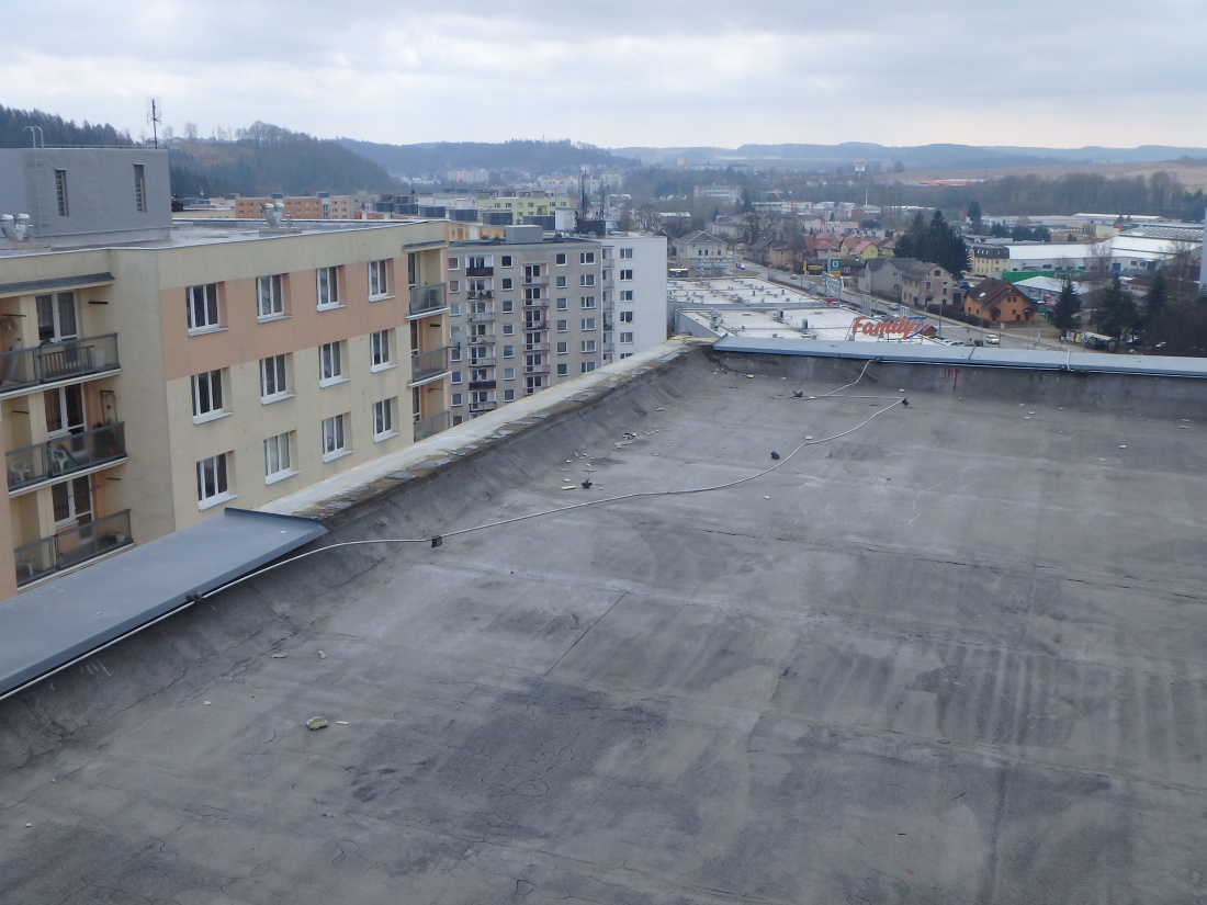 Trutnovští profesionální hasiči zabezpečovali natrženou střechu na panelovém domě v Kopretinové ulici. Kvůli větru nebylo možné využít výškovou techniku, proto provedli hasiči opravu přímo ze střechy.