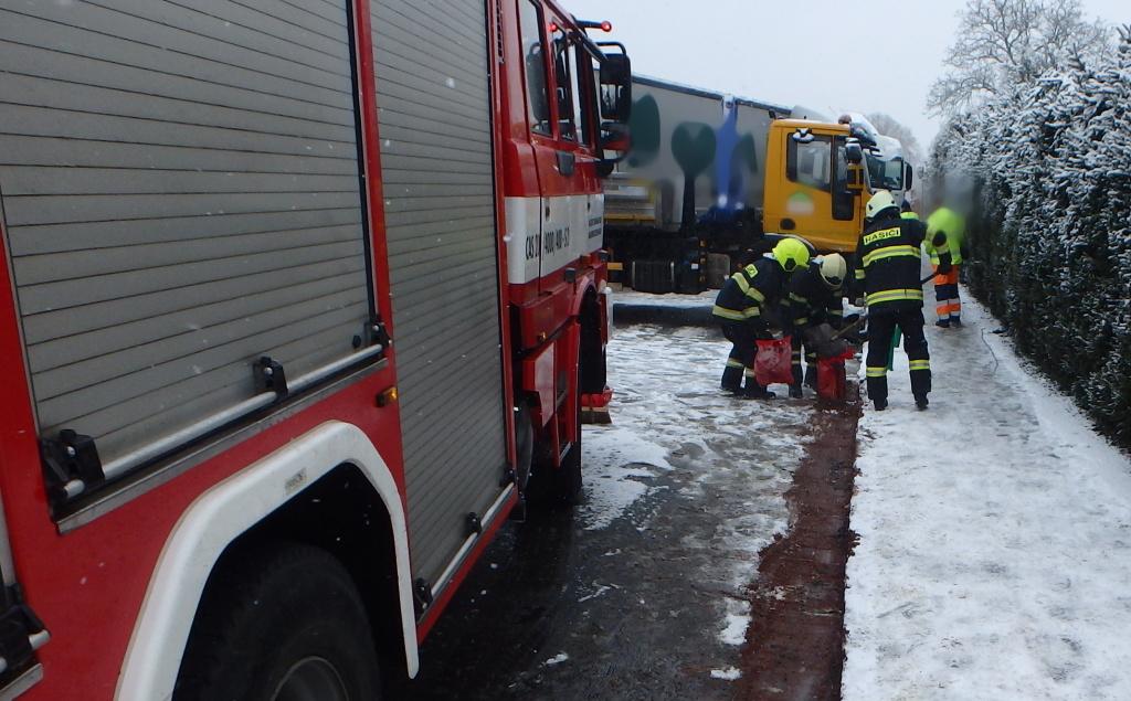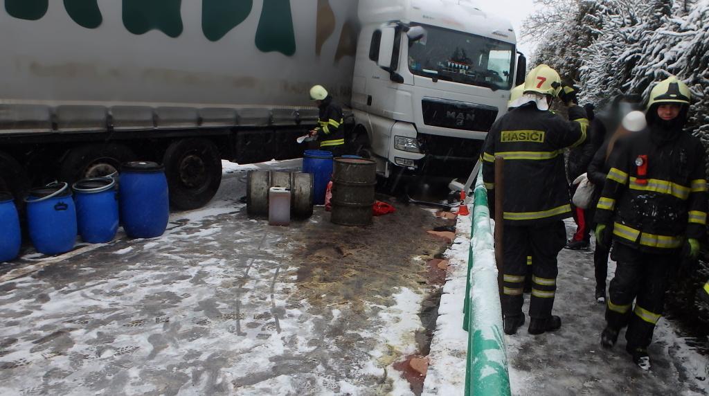 V Nemojově dnes dopoledne zasahovalo hned několik jednotek profesionálních i dobrovolných hasičů. Na místo vyjely jednotky v 8:02, kdy byla oznámena dopravní nehoda kamionu s návěsem. Vozidlo dostalo smyk, narazilo do zábradlí a začala z něj unikat nafta. Za kamionem havaroval ještě jeden nákladní automobil.